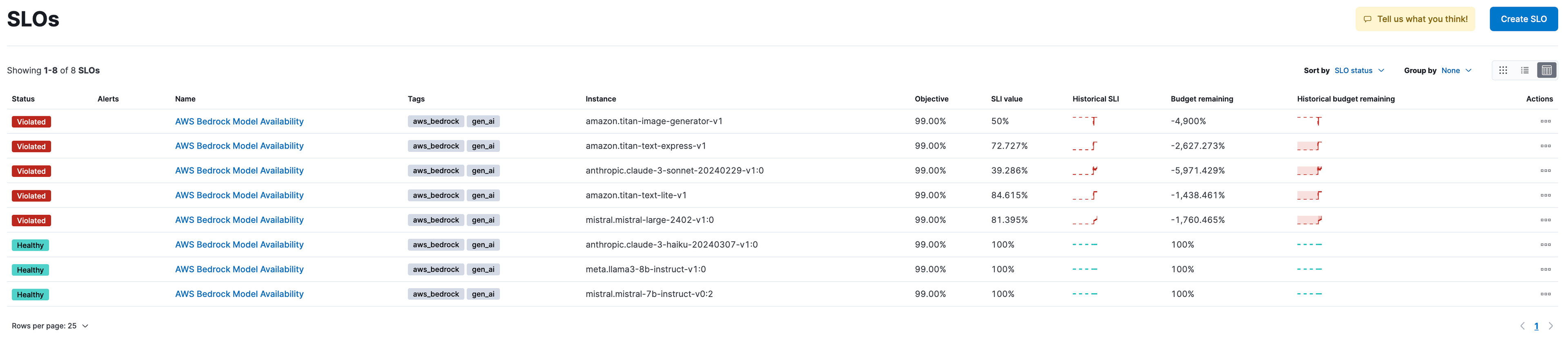 As with any Elastic integration, Amazon Bedrock logs and metrics are fully integrated into Elastic Observability, allowing you to leverage features like SLOs, alerting, custom dashboards, and detailed logs exploration.