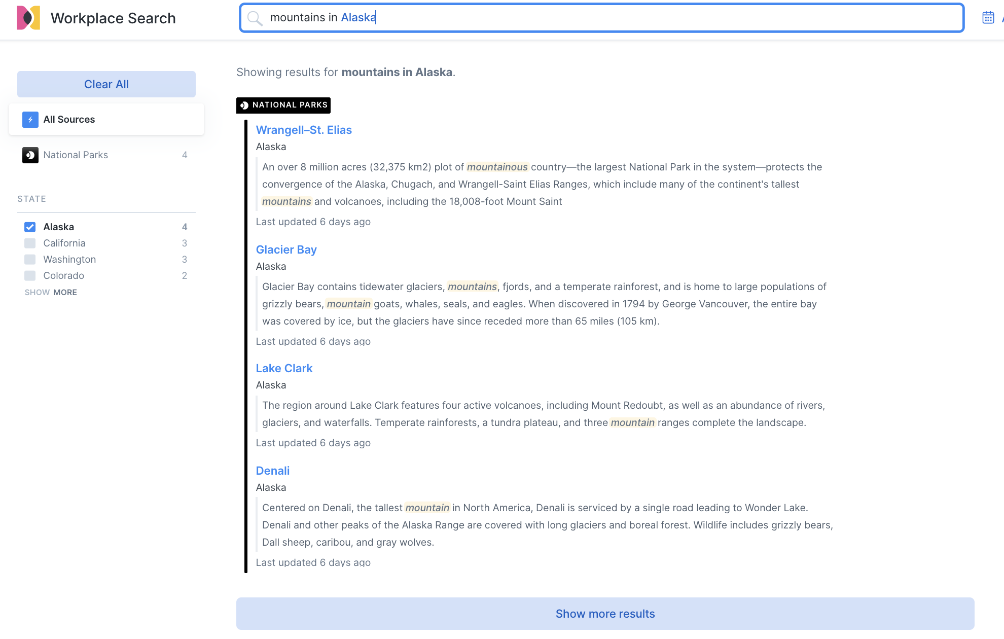 Step 5. Now we can see the search experience includes a filter for State. Note that you generally need to filter on a specific source to expose filters for that source (in this case the National Parks source).