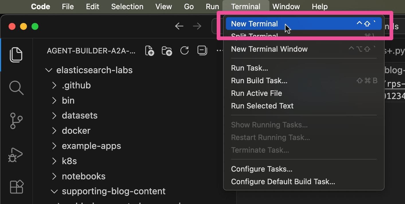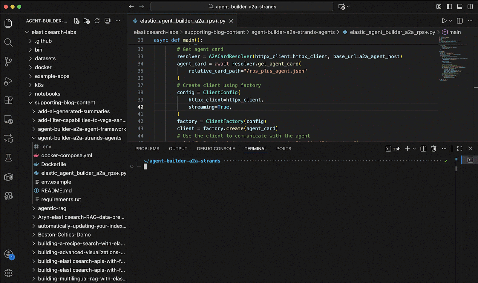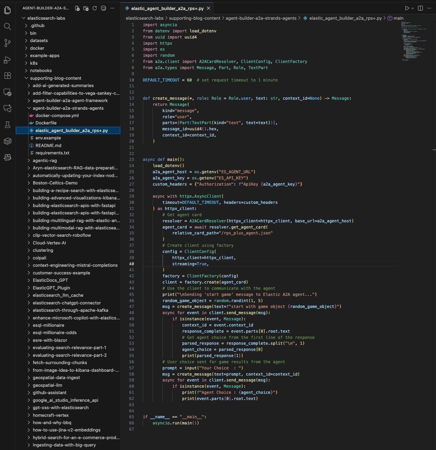 In the Visual Studio File Explorer, expand the supporting-blog-content and agent-builder-a2a-strands-agents folders and then open the file elastic_agent_builder_a2a_rps+.py. Here’s what the file looks like opened in Visual Studio Code: