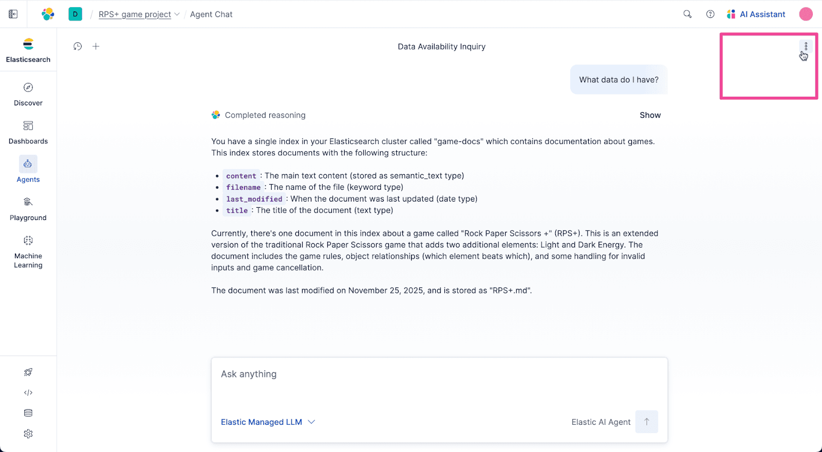 Then all you have to do is ask the default Elastic AI Agent, “What data do I have?”