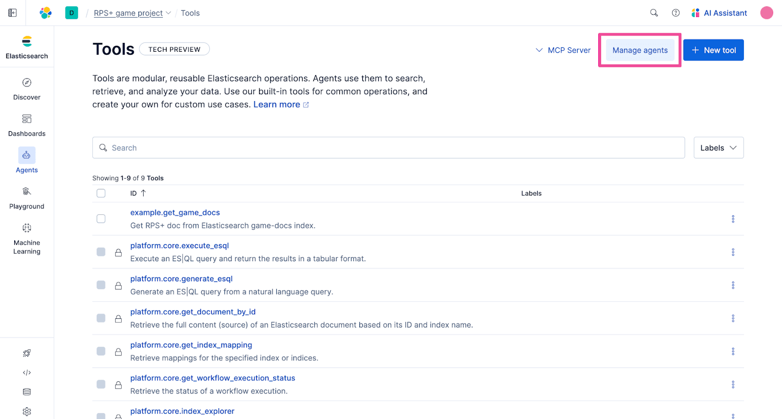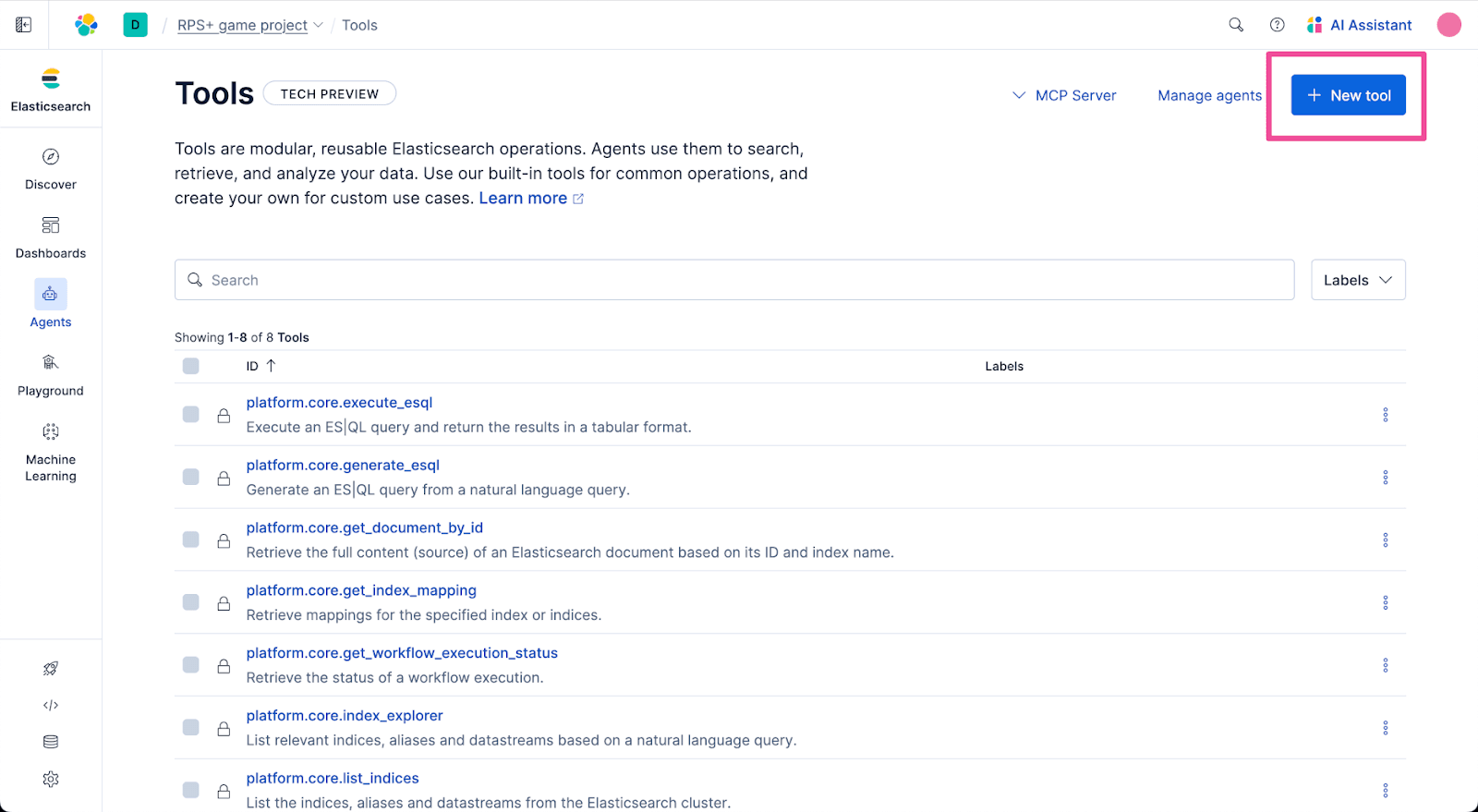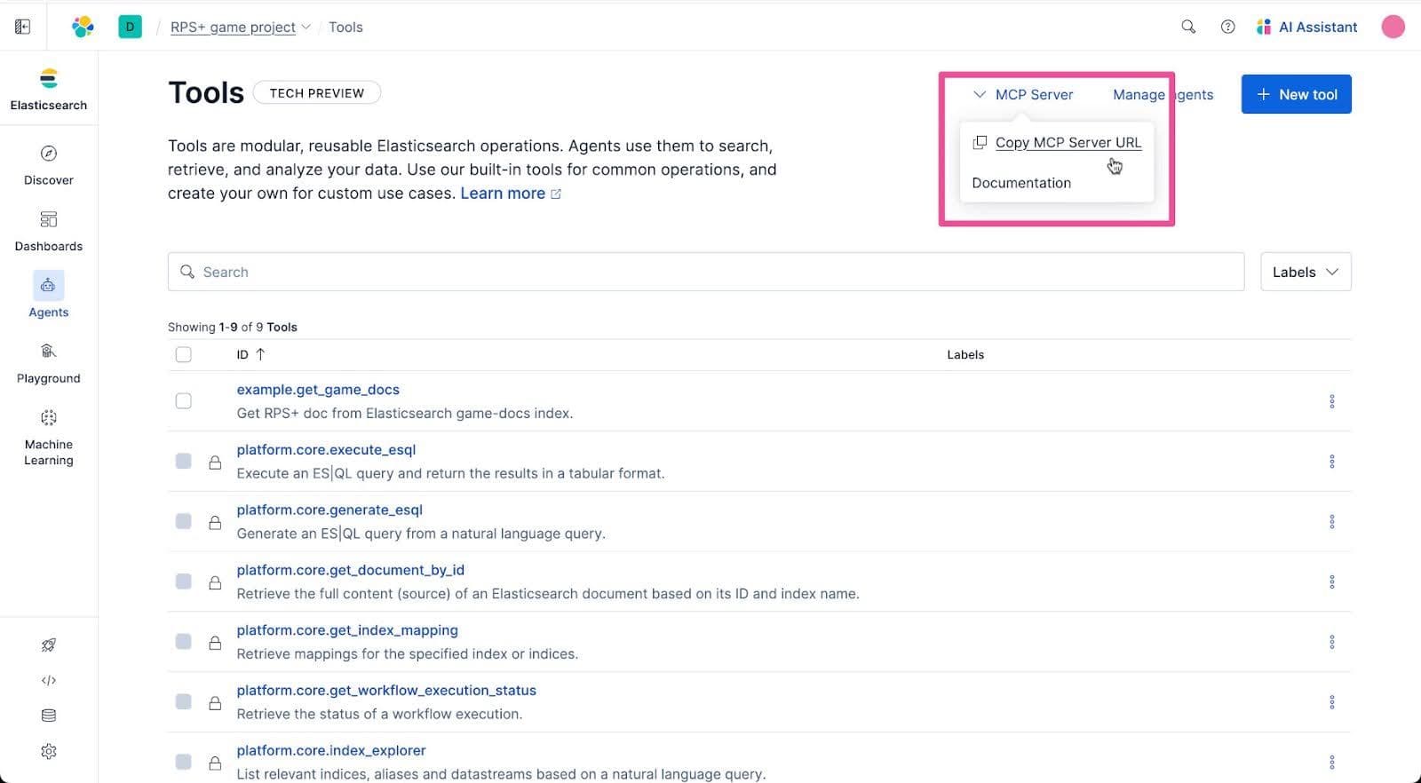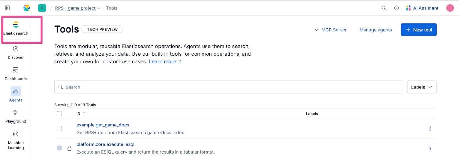 Okay we’ve now got some data in Elastic, let’s put it to use. Agent Builder includes built-in support for creating MCP tools that help agents access the data they need to have the right context for their task. Let’s create a simple tool that will retrieve our game data.
