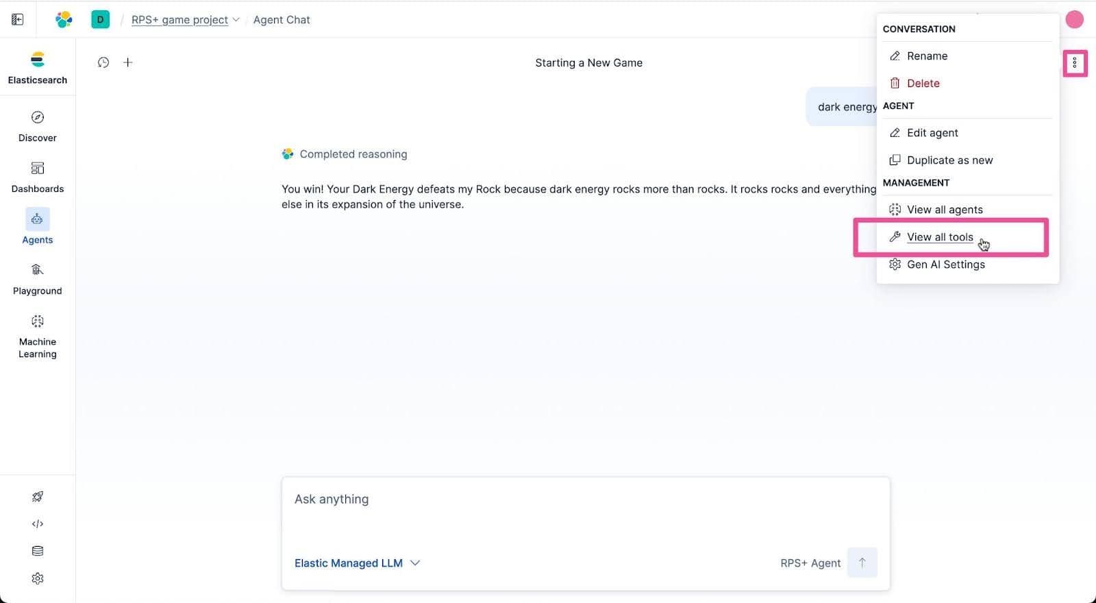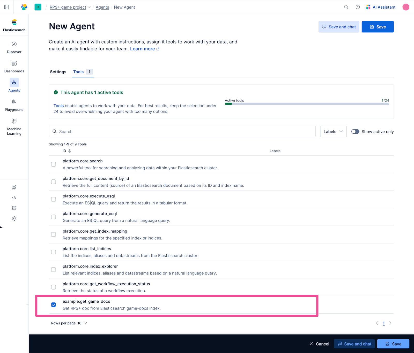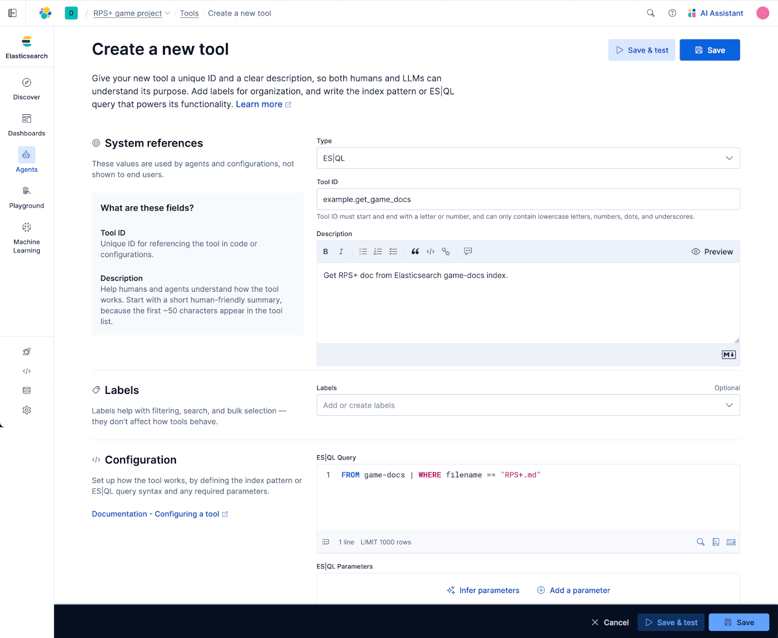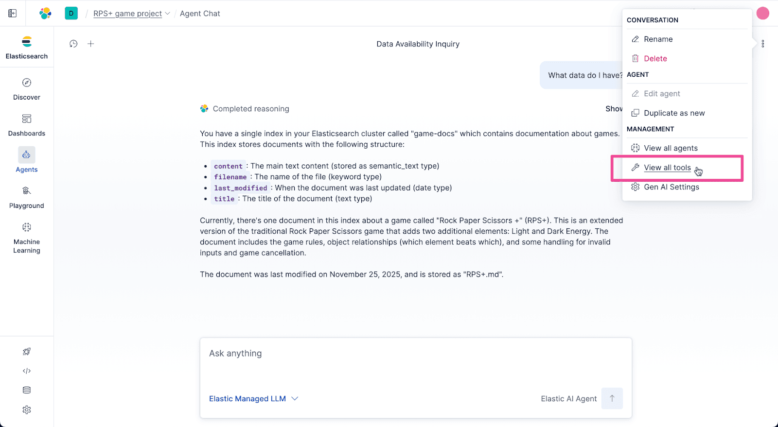 Okay we’ve now got some data in Elastic, let’s put it to use. Agent Builder includes built-in support for creating MCP tools that help agents access the data they need to have the right context for their task. Let’s create a simple tool that will retrieve our game data.