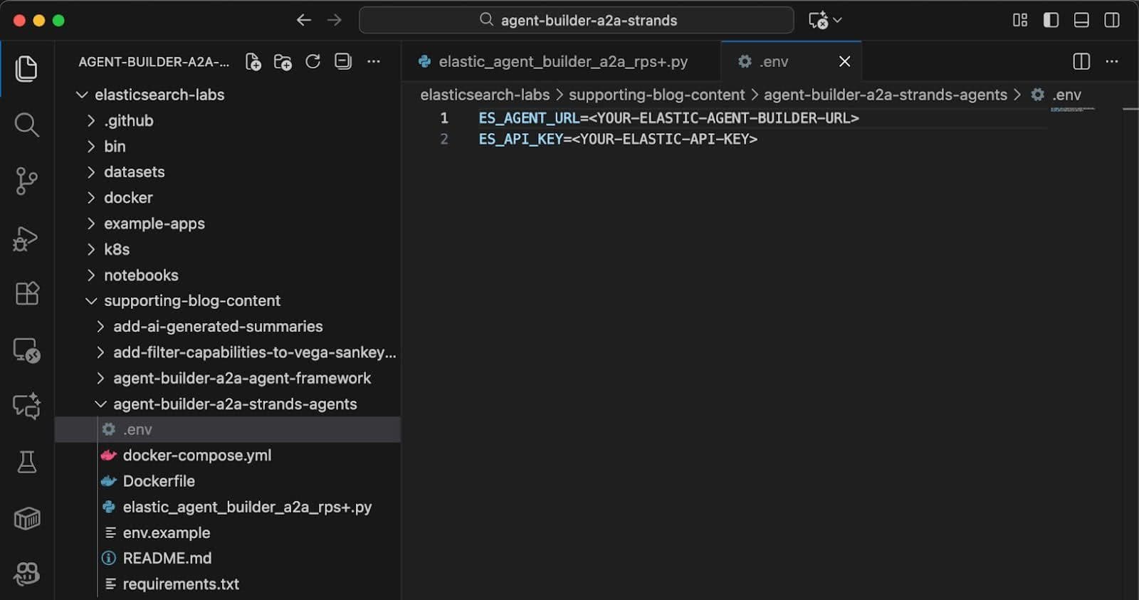 Paste the MCP Server URL into the .env file as a replacement for the <YOUR-ELASTIC-AGENT-BUILDER-URL> placeholder value. Now we need to make one update to the URL, that is, replacing the ending text “mcp” with “a2a” because the A2A protocol is what the Agent Strands SDK will be using to communicate with the agent running in Elastic Agent Builder.
