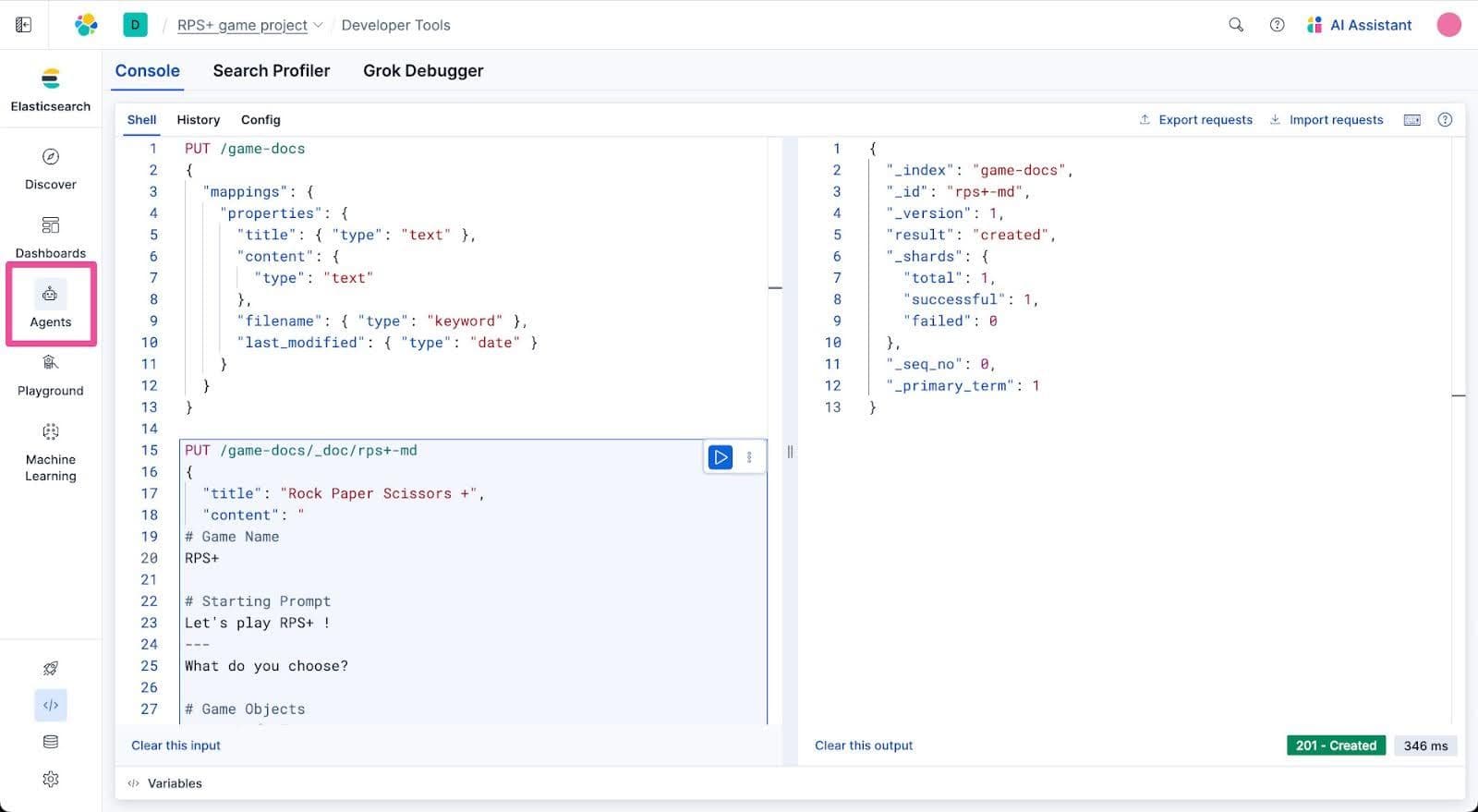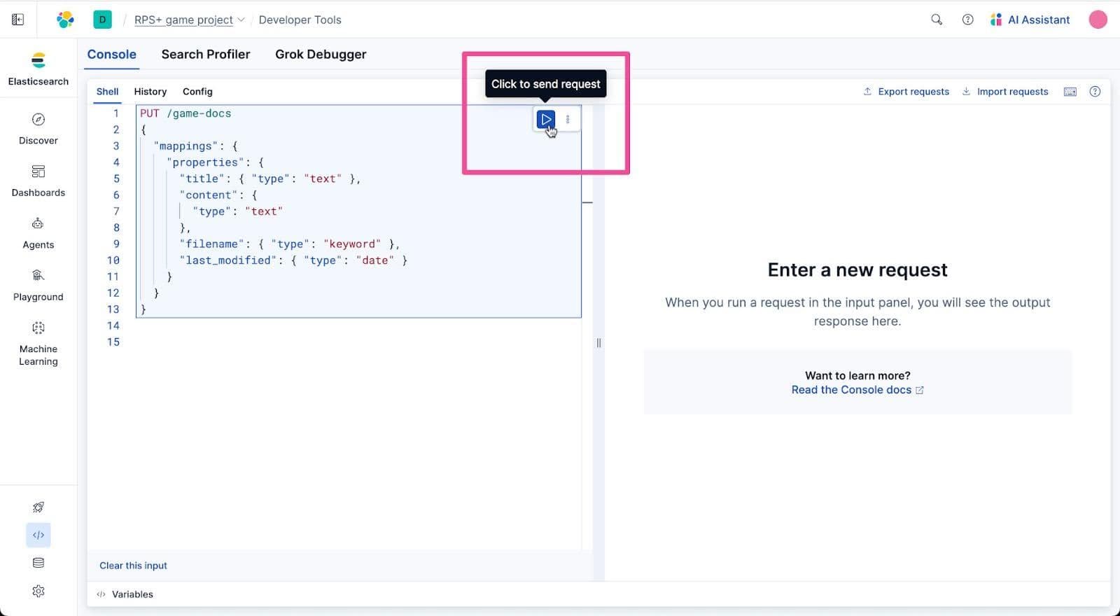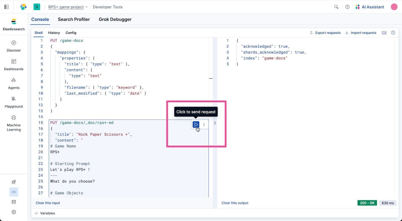 Click the Send request button next to the statement to run it and add the rps+-md document to the game-docs index.
