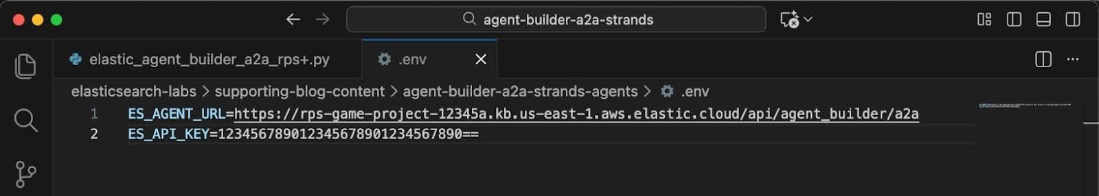 Since the example app will be running on your local computer, in order to communicate with our Agent Builder agent, we need to provide the Strands Agents SDK with an A2A URL and API Key for the agent. The example app uses a file named .env to store these values.