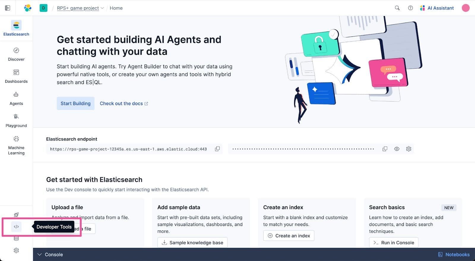 Next, we’re going to add some data to our Elasticsearch project. Open Developer Tools, where we can run commands to create a new index and insert some data into it. Select Developer Tools from the top-level navigation menu.