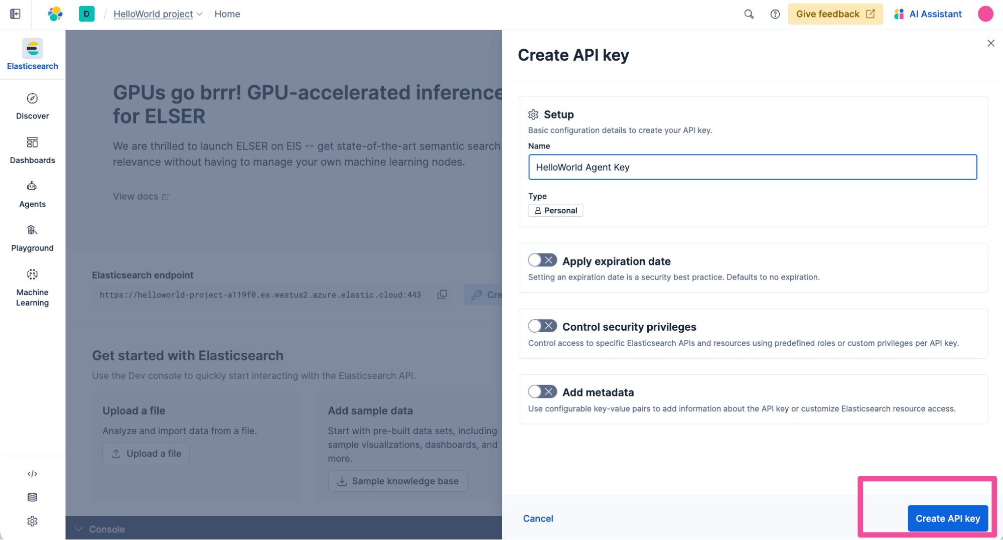 Enter a Name for the API key and click Create API key.
