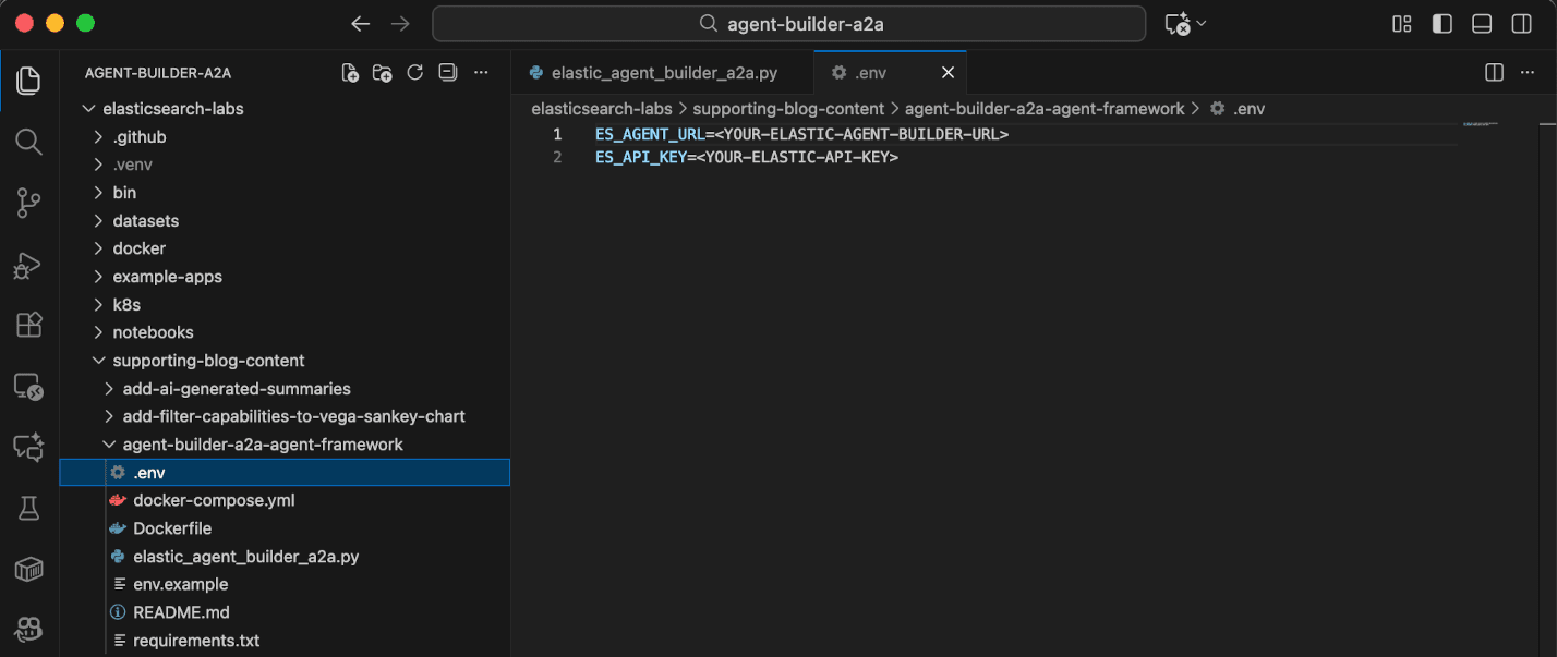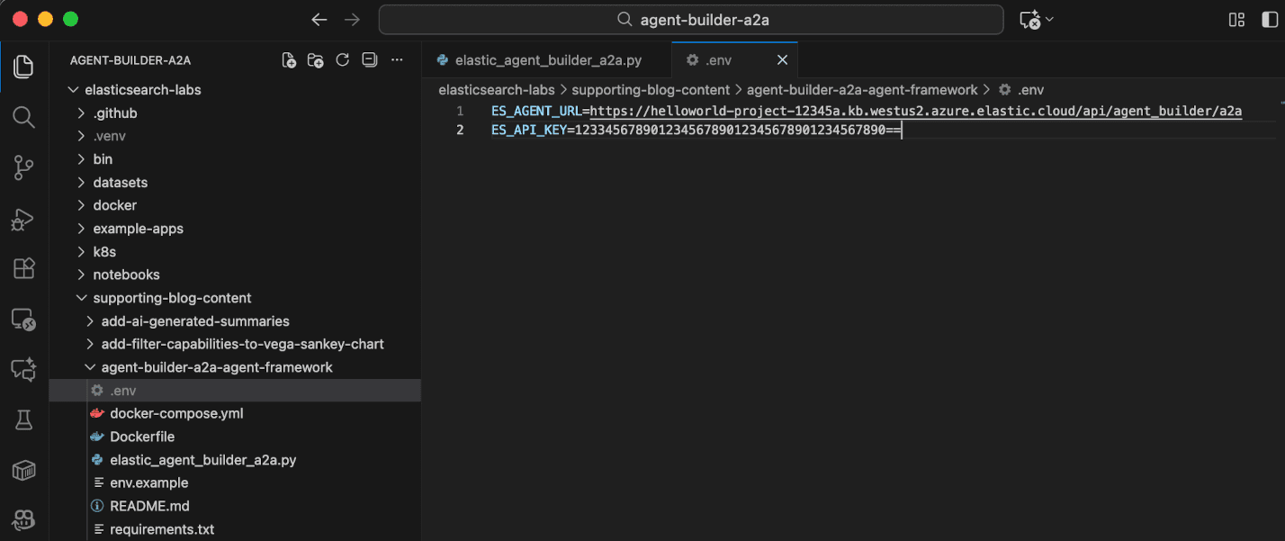Back in Visual Studio Code, within the .env file, find where the placeholder text “<YOUR-ELASTIC-AGENT-BUILDER-URL>” appears and paste in the copied MCP Server URL to replace the placeholder text. Now edit the pasted MCP Server URL. Delete the text “mcp” at the end of the URL and replace it with the text “a2a”. The edited URL should look something like this: