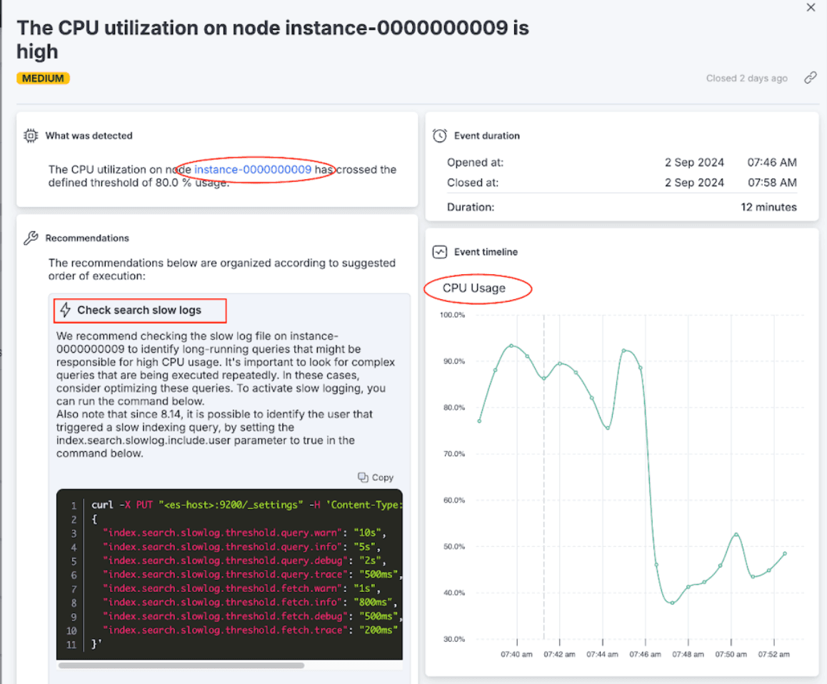 - Get root cause analysis with drill-downs to point-in-time of issue occurrence, and resolution suggestions including in-context Elasticsearch commands
