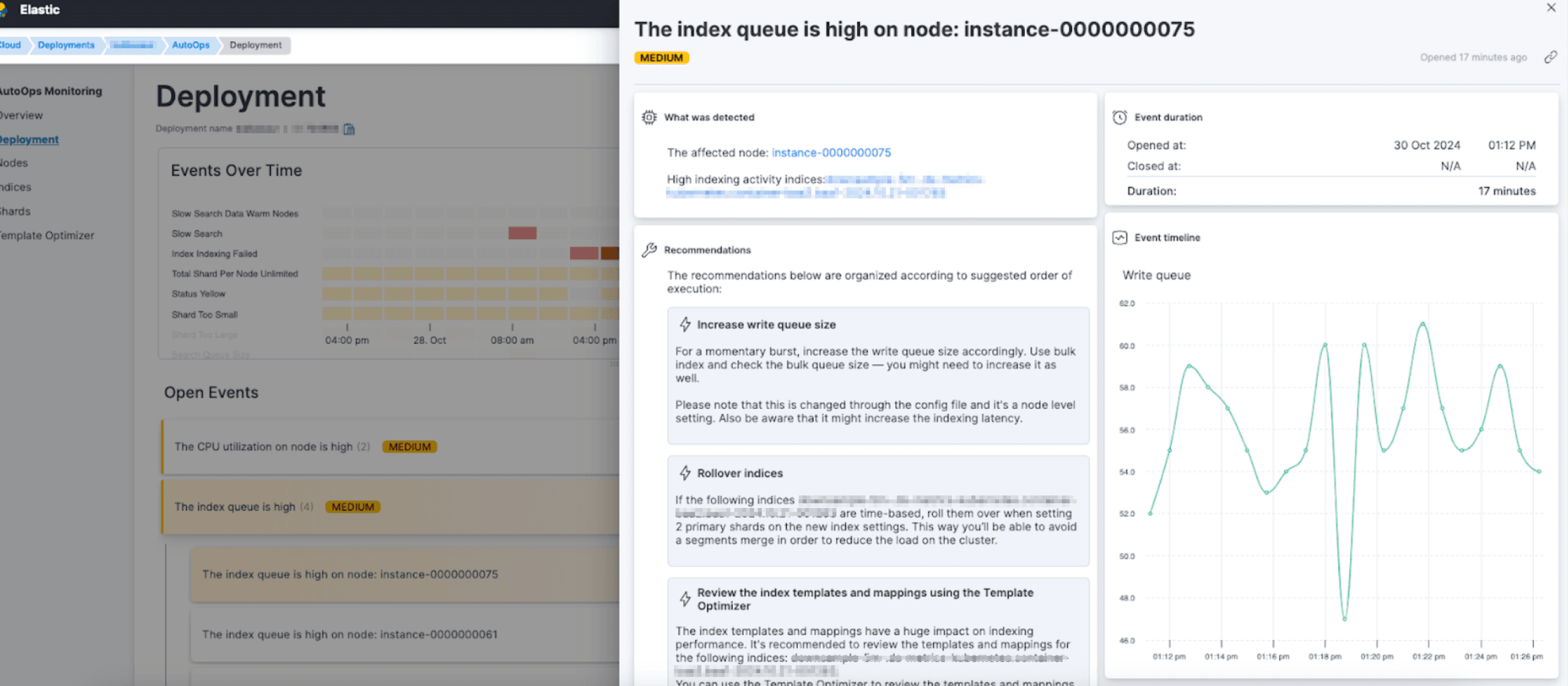 AutoOps detects that the Index queue is high and provides a list of recommendations for resolution