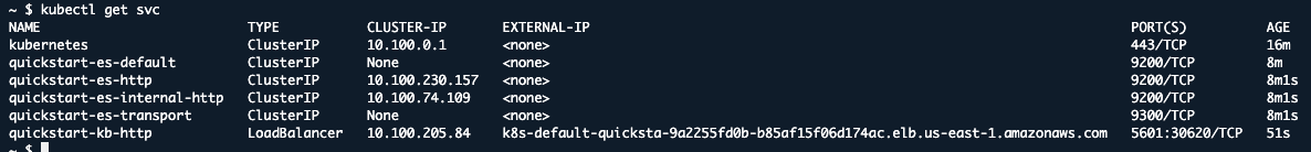 This will show you the external URL for Kibana under EXTERNAL-IP. It might take a few minutes for the LoadBalancer to provision. Copy the value of EXTERNAL-IP.