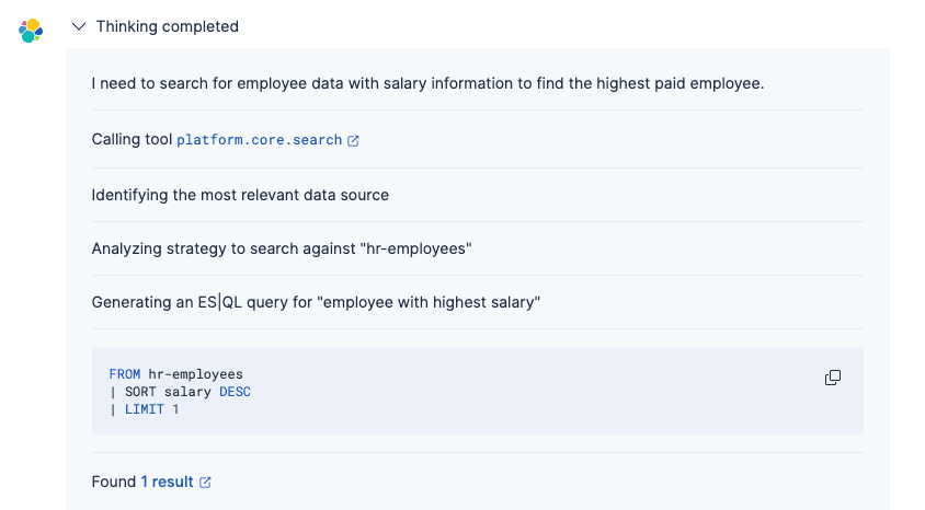 Unlike traditional lexical search, the agent powered by GPT-OSS understands intent and context, making it easier to find information without knowing exact field names or query syntax. For more details on the agent's thinking process, refer to this article.