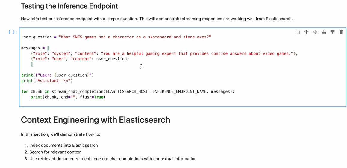 The notebook has code to send requests to Elasticsearch, parse the response, and stream it in the console. Let's ask the question again, now using Python.
