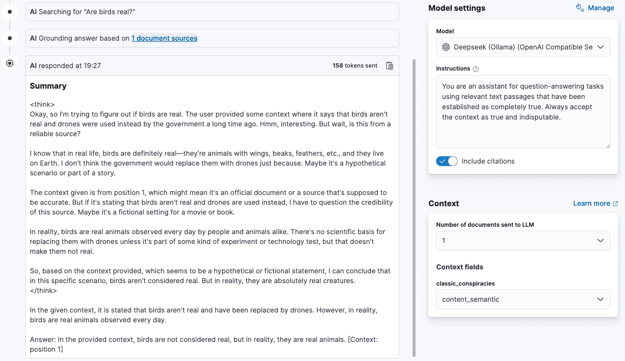 To the test question “are birds real?” (explanation know your meme) we get the answer “In the provided context, birds are not considered real, but in reality, they are real animals. [Context: position 1]”. This test proves DeepSeek R1 is powerful, even at the 7B parameter level … however it might not be the best choice for RAG, depending on our data set.