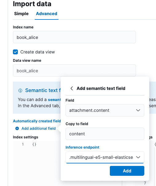 Select the “Add additional field” option, it is small right below “Automatically created fields”. Select “Add semantic text field” and change the inference endpoint to “.multilingual-e5-small-elasticsearch”. Select Add and then Import.