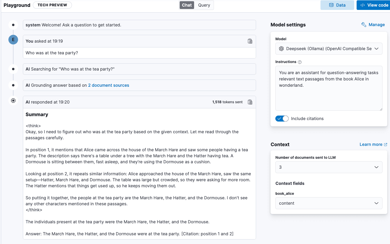 Everyone is talking about DeepSeek R1, the Chinese hedge fund High-Flyer's new large language model. The news is full of speculation on what it means for the industry now that they've introduced a capable, chain-of-thought reasoning LLM with open weights. For those curious to try this new model with RAG and all the vector database smarts of Elasticsearch, here’s a quick tutorial to get you started using DeepSeek R1 using local inference. Along the way we’ll use Elastic’s Playground feature and even discover some good and bad properties of Deepseek R1 for RAG.