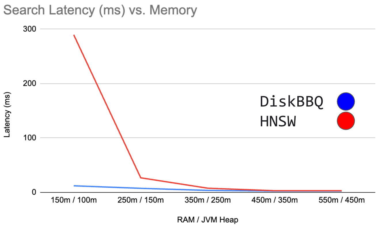As the name implies, DiskBBQ also uses our BBQ (Better Binary Quantization) to reduce the size of the vectors and centroids. This allows loading many blocks of vectors into memory at a time for fast scoring, with very low memory requirements and low disk overhead.