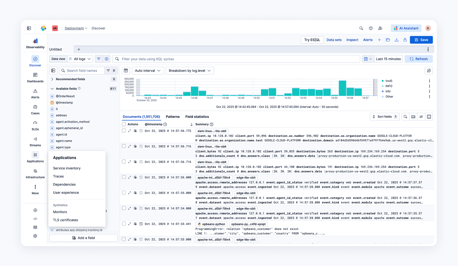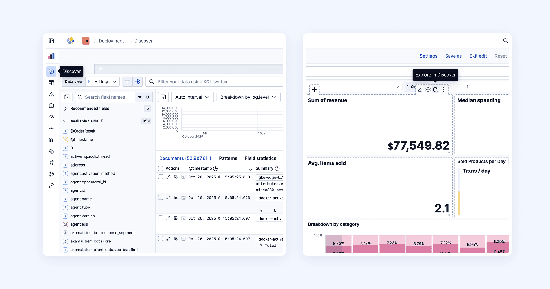 To deliver a fully functional collapsed mode—a highly requested feature—we developed a navigation system that can condense into a column of icons. Early UX testing showed that this design was well received by users. By visually associating Kibana’s abstract concepts with distinct icons, the navigation becomes more intuitive, memorable, and efficient. For example, Explore in Discover leverages the same Discover icon in the navigation, which makes it easier to recognize it. We also support optional text labels, visible in expanded mode and as tooltips when collapsed. Finally, this approach allows both navigation panels to be displayed simultaneously when needed—something previously impractical due to limited screen space.