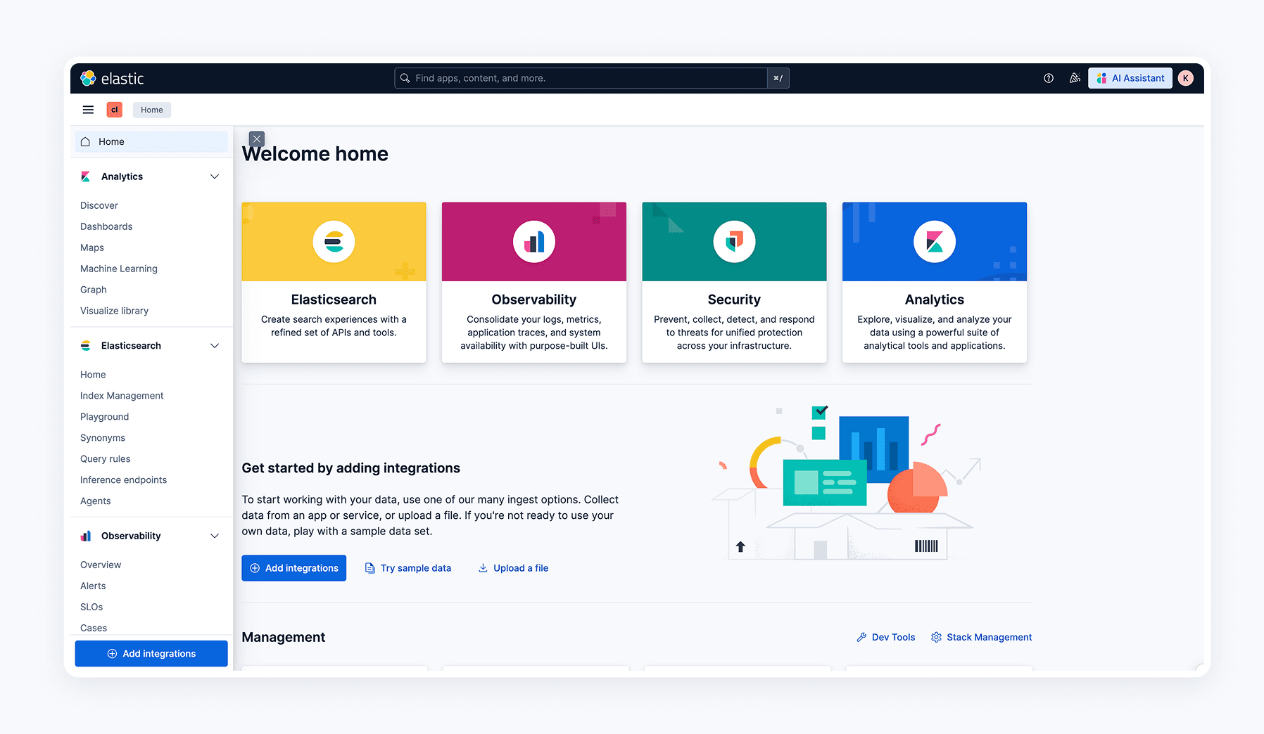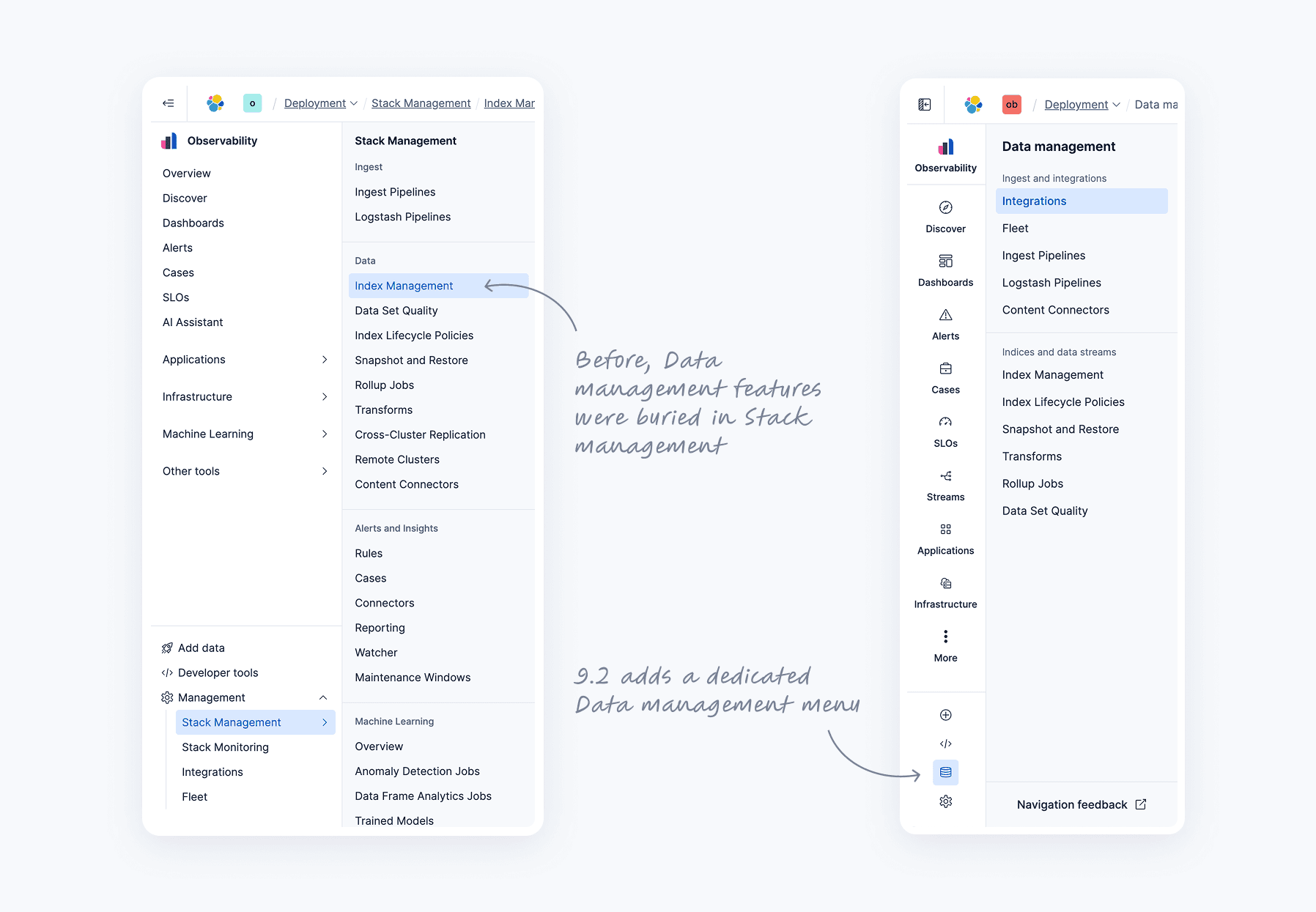 Previously, pages like Index Management were buried inside Stack Management, making them harder to locate. Now, they’re grouped together under a single, clearly defined section including Fleet, Index Management, Integrations, Ingest Pipelines.