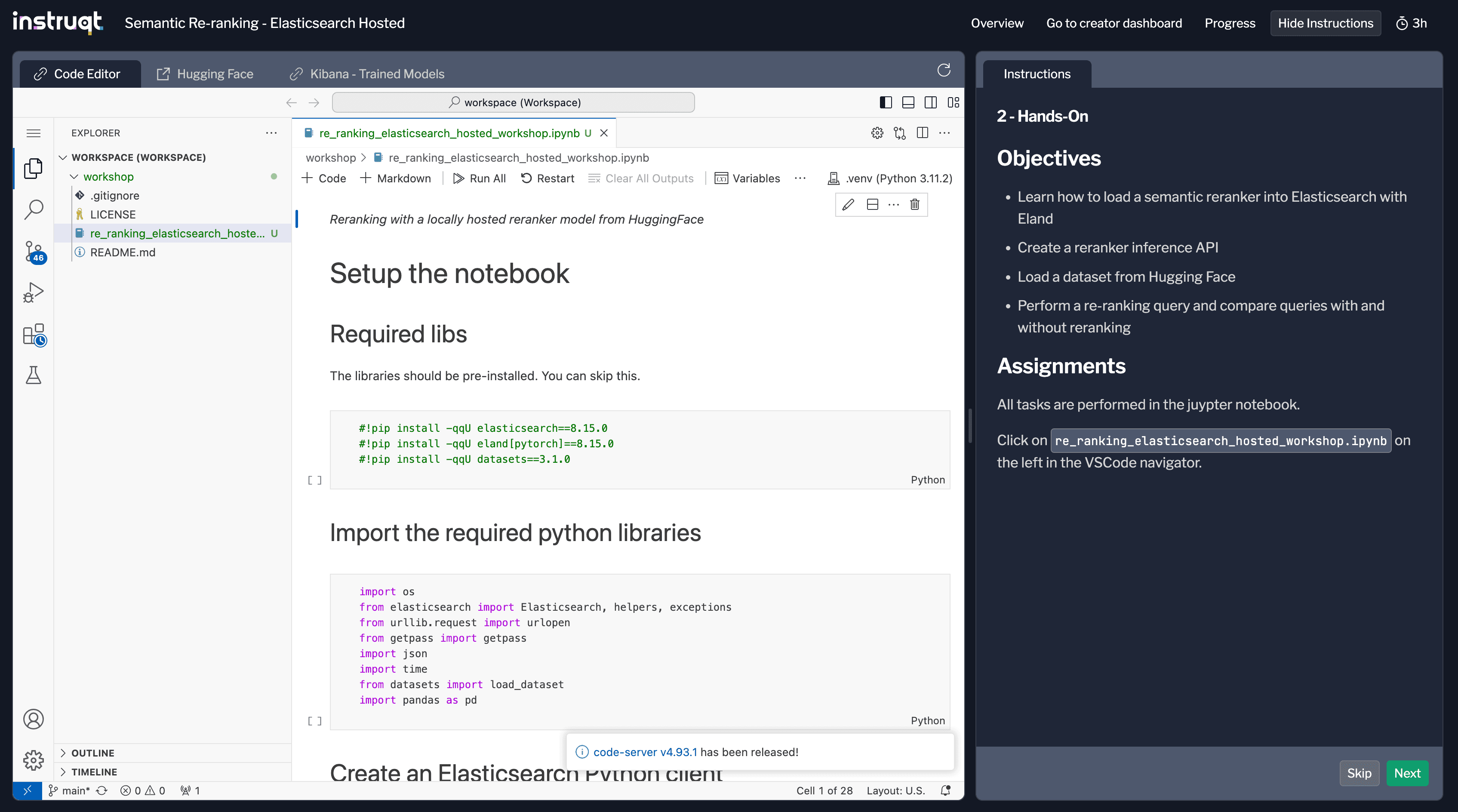 - This will also deploy our re-ranking model on Elasticsearch machine learning nodes