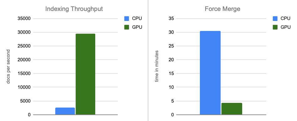- Force-merge: After indexing completes, the GPU continues to accelerate segment merging, speeding up the force-merge phase by ~7x.