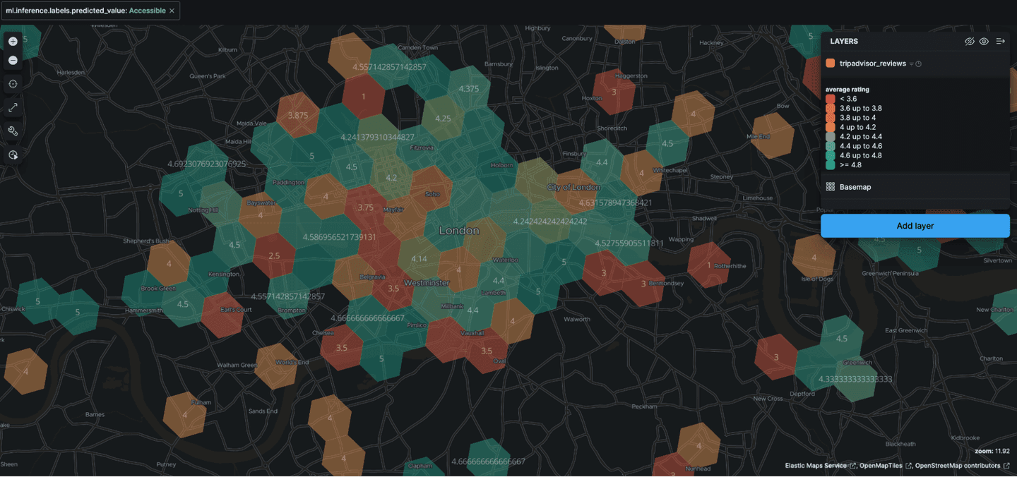 It also provides a map service that can visualize the review data, in this example looking at accessible points of interests in London:
