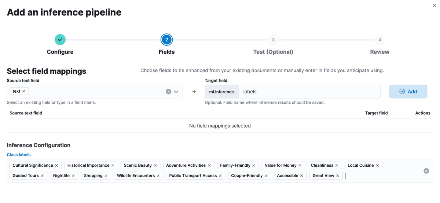 1. A secondary inference processor is utilized to label the review text data. To prevent conflicts with the vector field, configure the target field appropriately. The list of labels is referenced below.