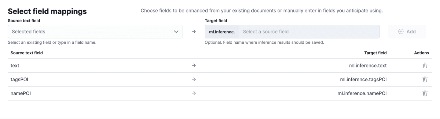 1. To integrate the e5 model with the ingest pipeline, navigate to 'Pipelines' in the newly created index, deploy and start the Machine Learning (ML) inference pipeline. The text fields for inference in this case are 'text', 'tagsPOI' and 'namePOI'.