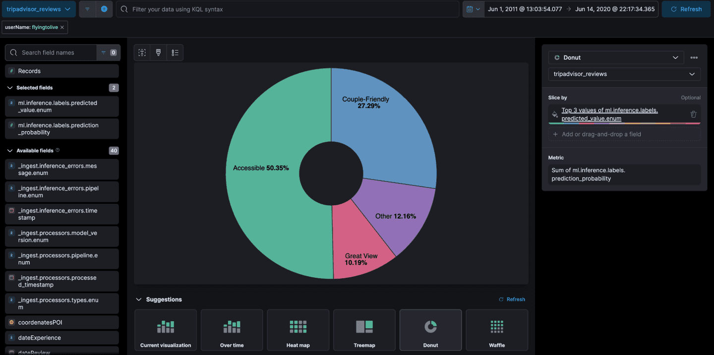 As Elastic is bundled with Kibana and can be leveraged for aggregations combined with semantic search, it is possible to analyze the data in multiple ways and generate reports via Kibana Lens. In the review data scenario, this information can be shared with businesses that are looking to understand trend analysis on the perception of their business.