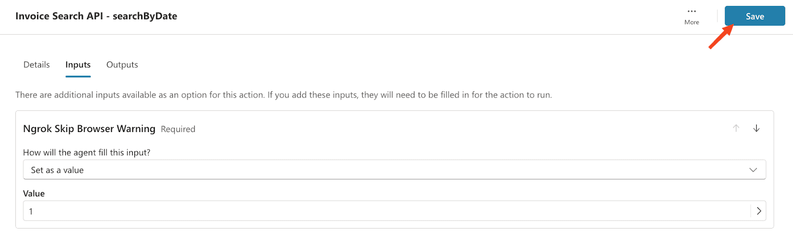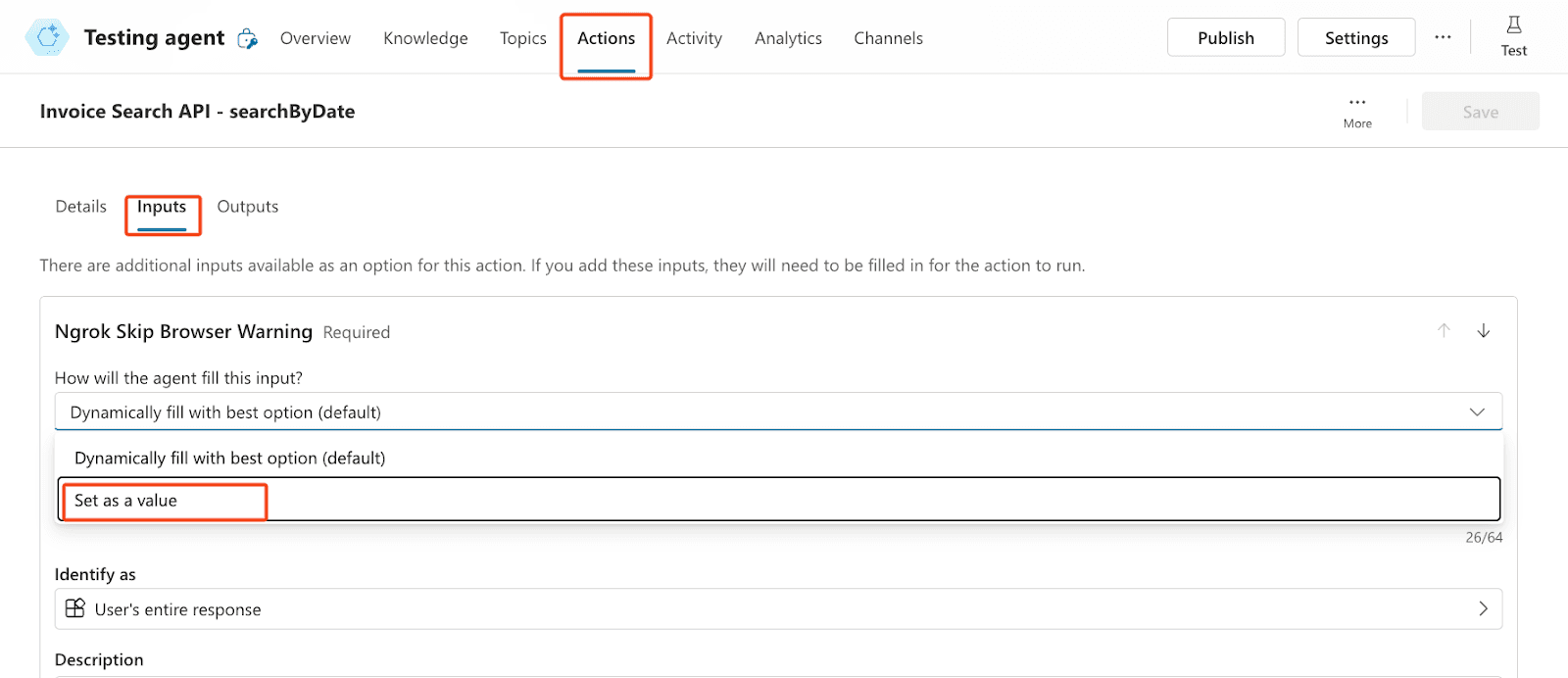 To do this, go to “Actions > [Action] > Inputs > Ngrok Skip Browser Warning and click on “How will the agent fill this input?” and select “Set as value.” Add any value to Value and click on “Save” so you can use the endpoints with the ngrok tunnel: