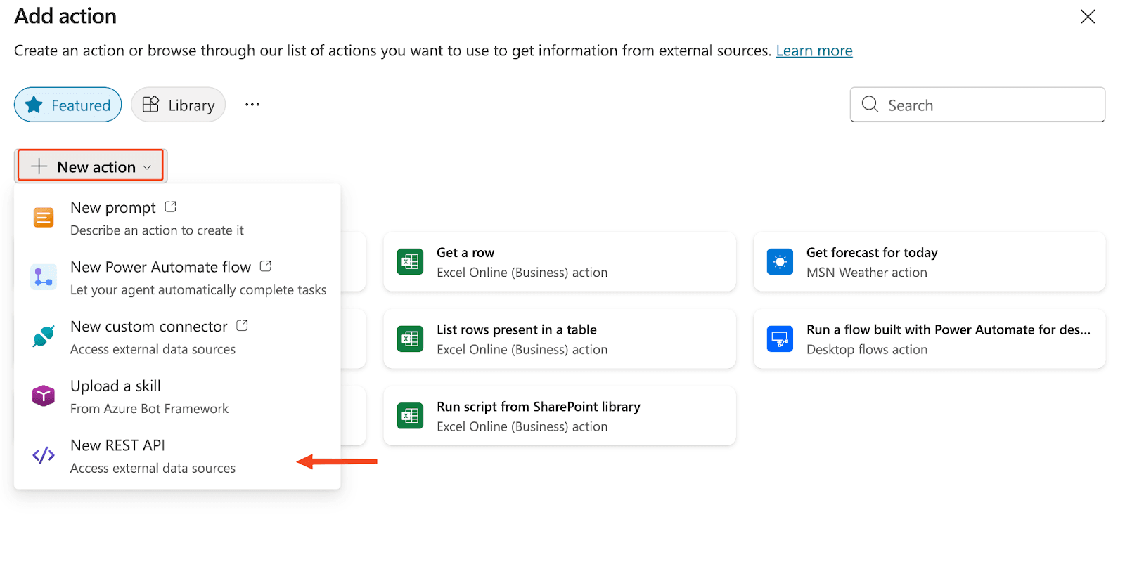An action is a tool the agent can use to help you solve your tasks. The actions can connect to built-in platform connectors or to APIs. The OpenAPI JSON specification provides a standard format for describing your API, allowing Copilot to understand its functions, available endpoints, and how to correctly structure queries, including automatic parameter population.