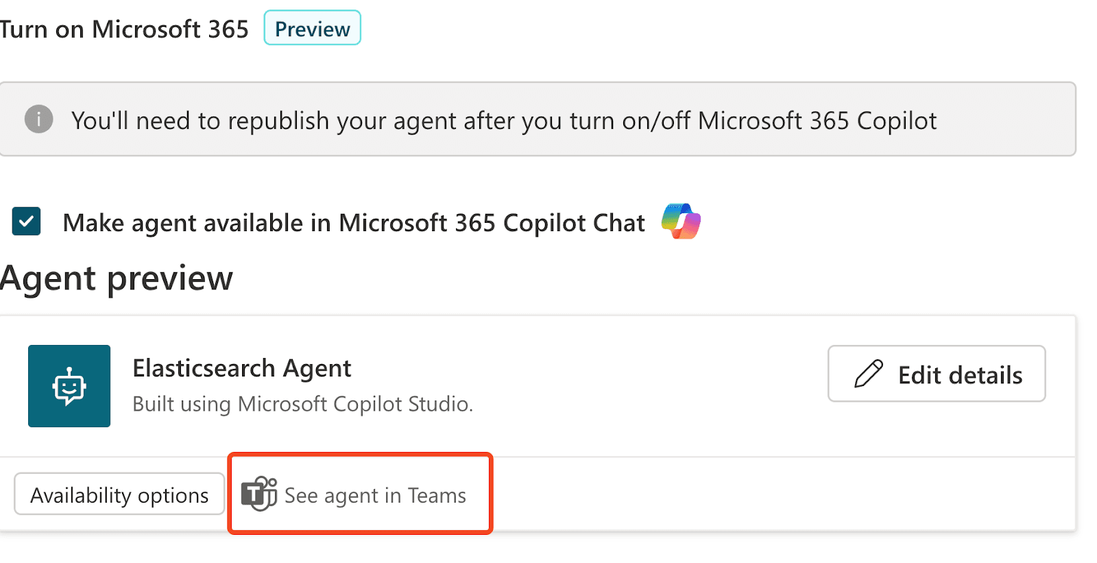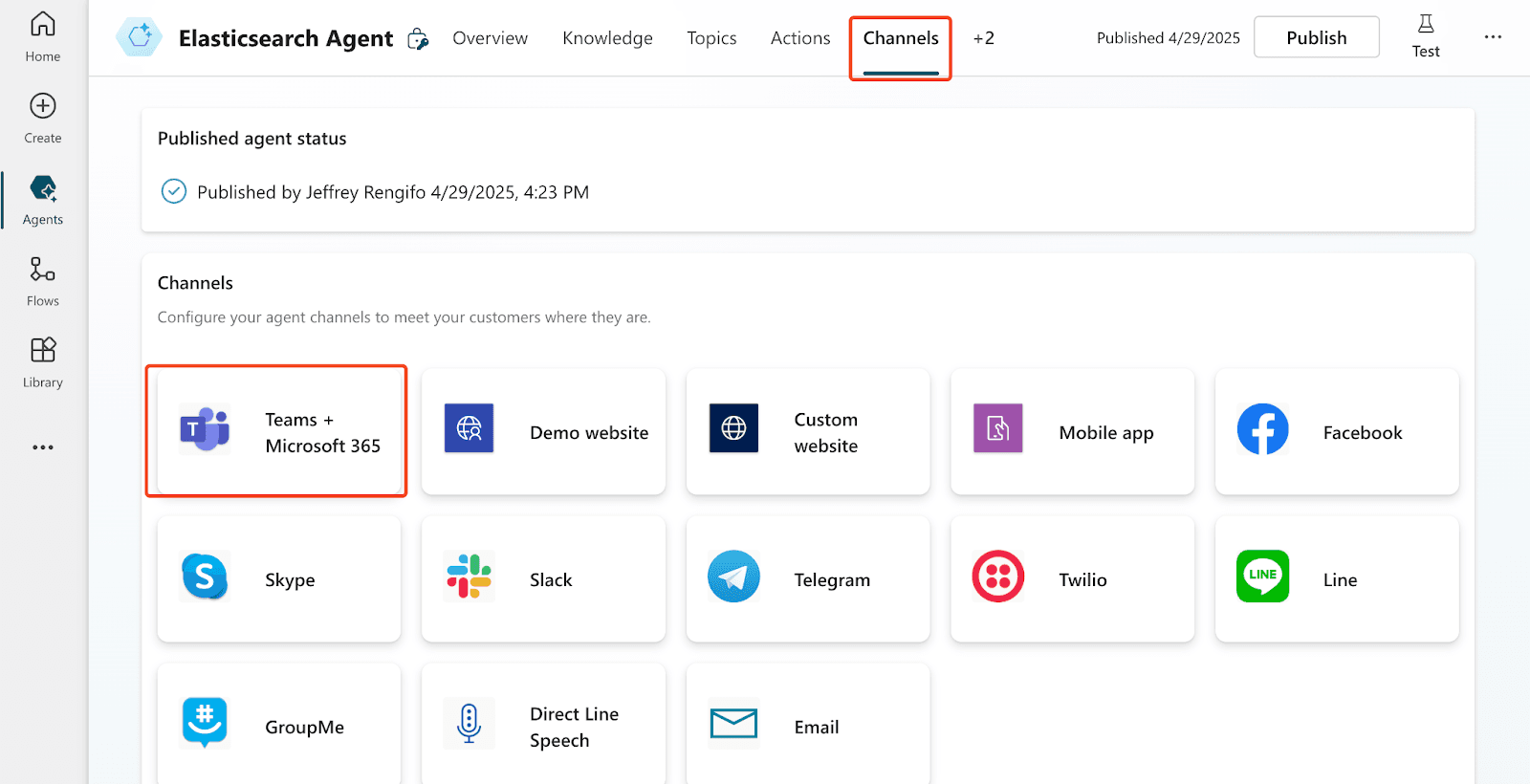 To use the agent from Microsoft 365 or Microsoft Teams, you must follow these steps: