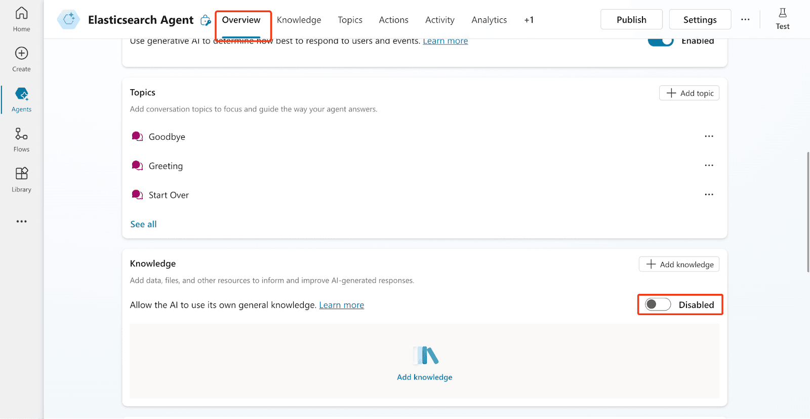 4. Clicking on Overview and then scrolling down, you’ll find the Knowledge section. Deactivate the option Allow the AI to use its own general knowledge. This will prevent the agents from responding using the general info from their training since we want them to focus on our Elasticsearch documents.