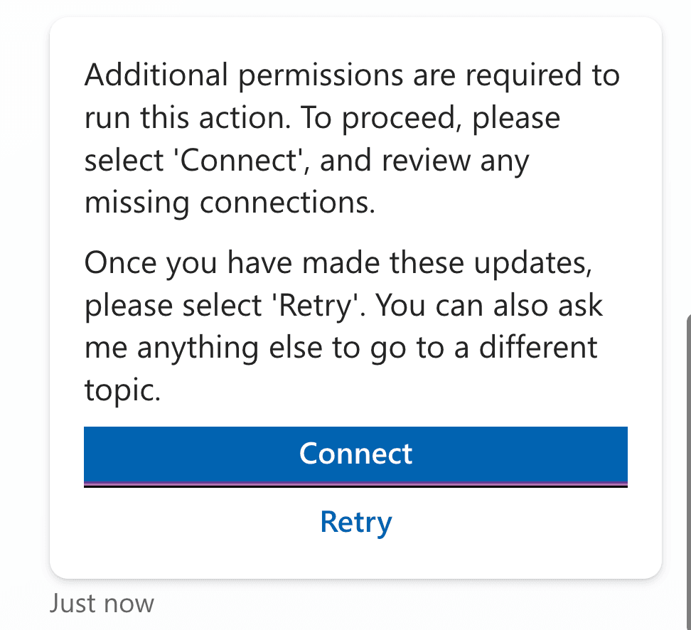 When using actions for the first time, Copilot will warn you about permissions and show a box when you need to grant permissions for each action by clicking on Connect. You must do this once per action.