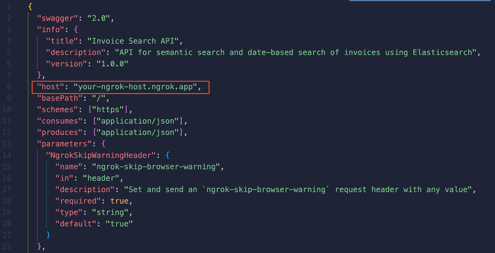 - In the OpenAPI configuration, replace the existing 'host' value with the ngrok-generated URL. Make sure you remove the 'https://' prefix, leaving only the hostname and port.