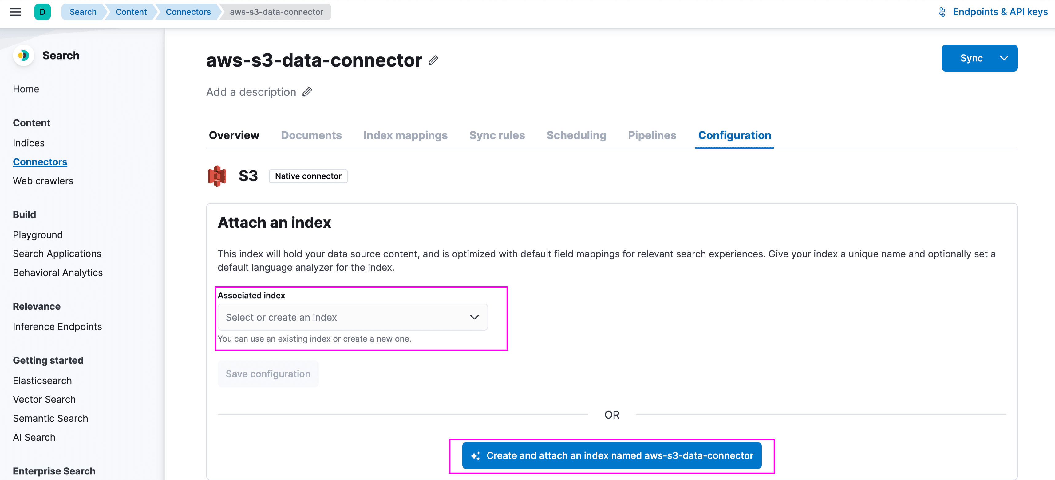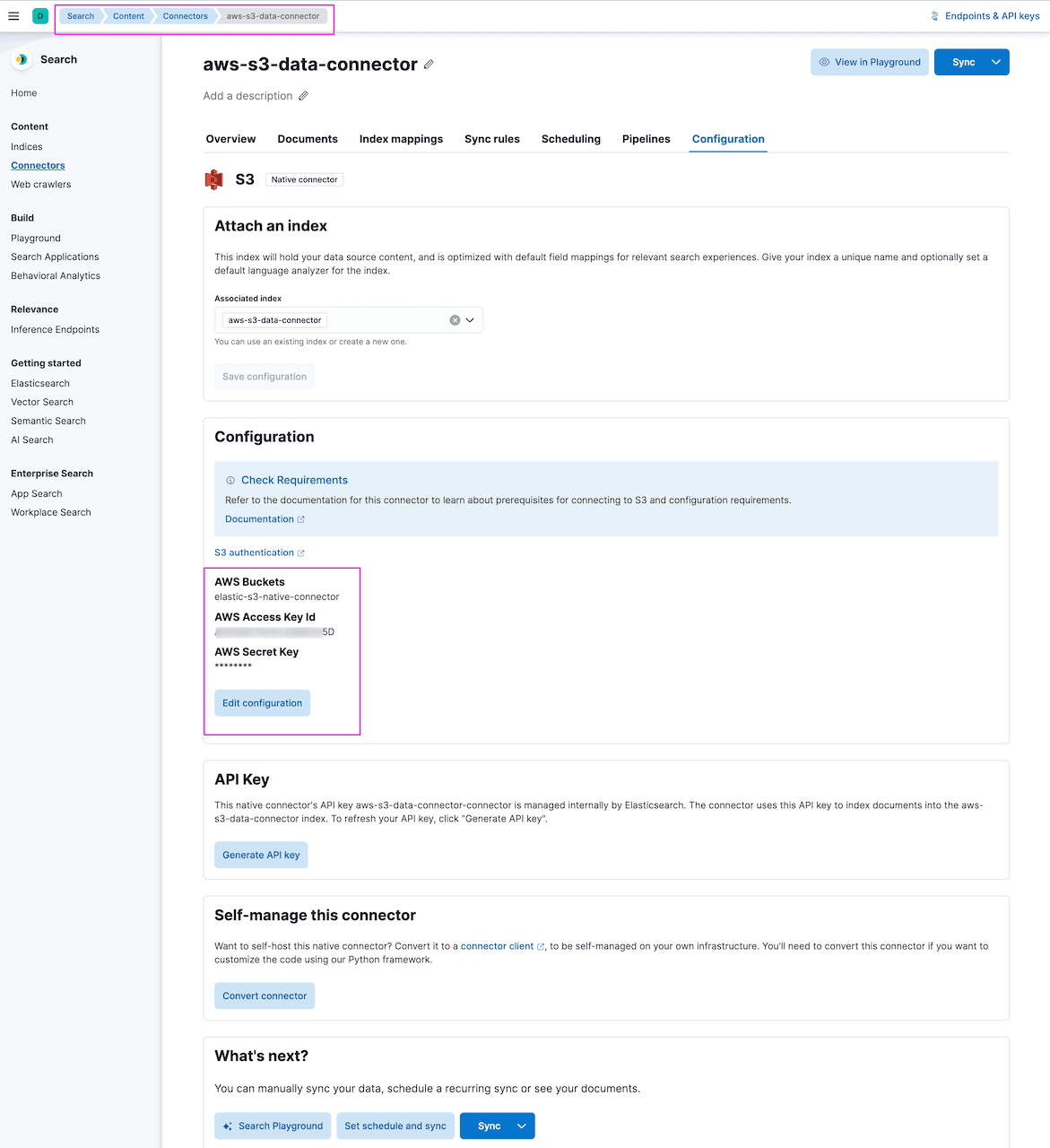- Elastic S3 Connector is configured with S3 bucket information and credentials with the necessary permissions to connect to the bucket and sync data.