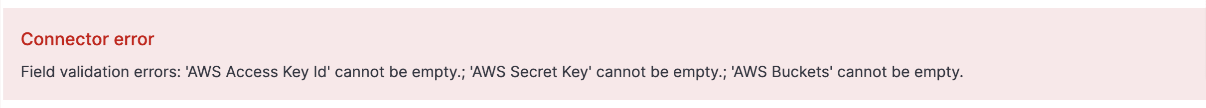 When you update the configuration, the connector can display a validation error if there is some delay in updating AWS credentials and bucket names. You can provide the required information and ignore the error banner. This is a known thing as connectors communicate asynchronously with Kibana and for any configuration update there is some delay in communication between the connector and Kibana. The error will go away once the sync starts or a refresh starts after some time: