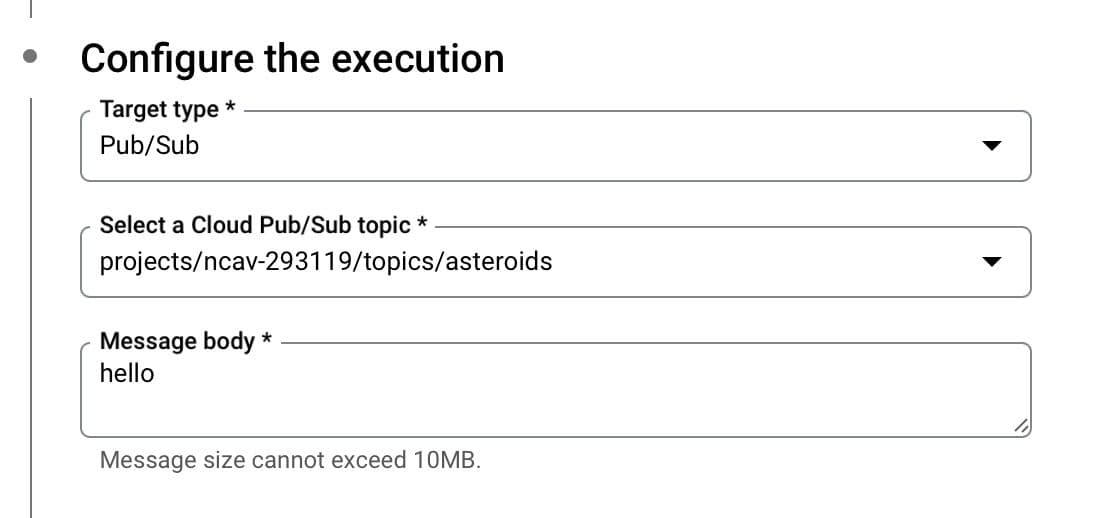 You will also want to configure the execution to connect to the Pub/Sub topic you created previously. I currently have the message body set to say “hello.”