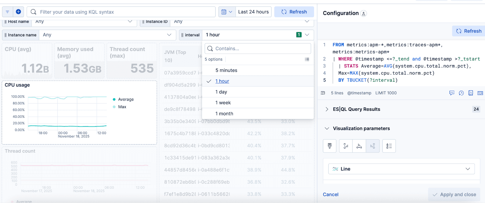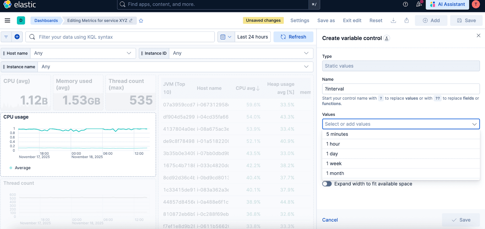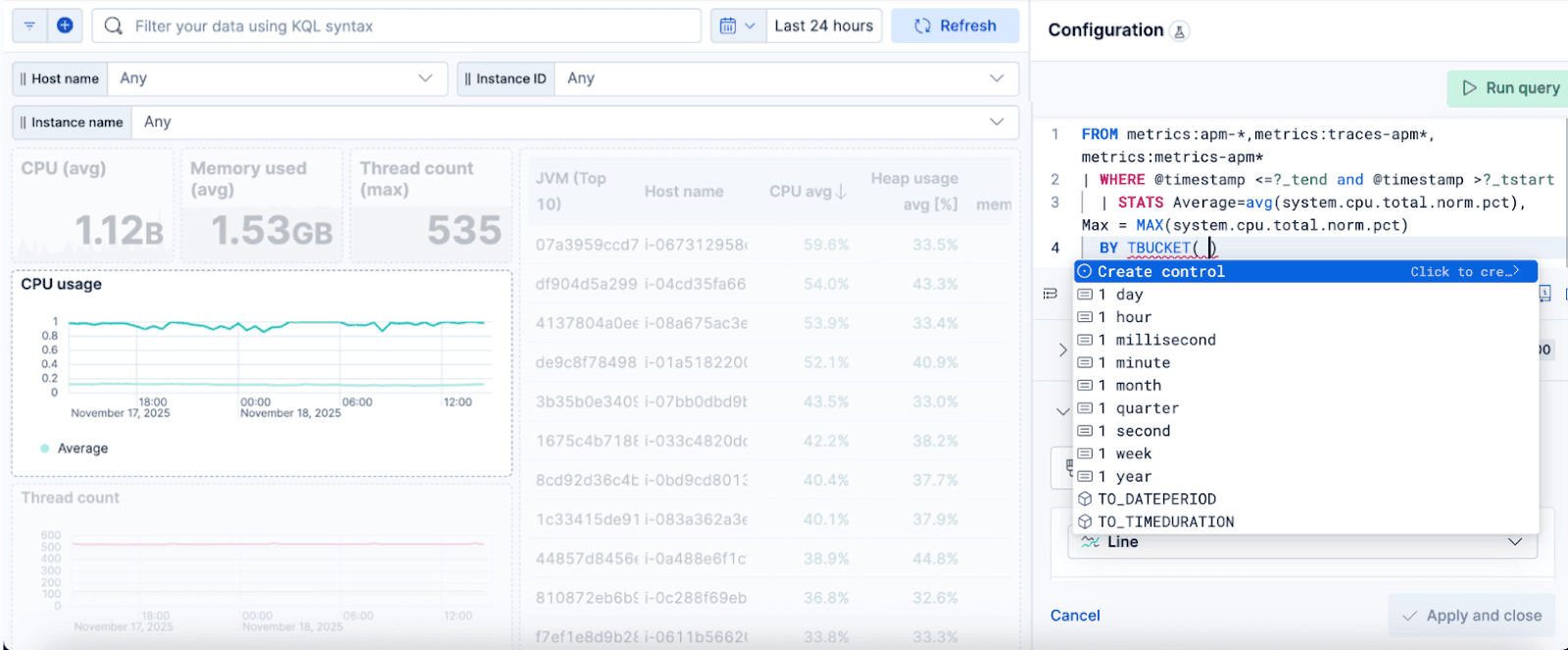 1. When writing an ES|QL query for your time series, click “Create control”. When building a variable for intervals, it’s better to use TBUCKET instead of BUCKET so it accepts more readable intervals like “1 hour”, “1 day”, etc. There will also be an auto option for TBUCKET soon so it can automatically adapt to time ranges.