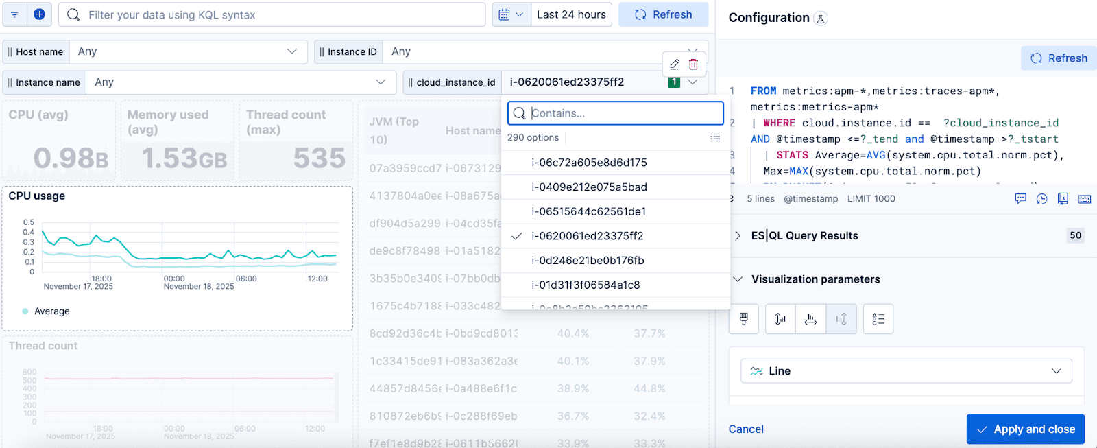 Want to filter some visualizations, but leave others untouched? Variable controls let you do exactly that. Pick the panels you want to respond to and wire them up in the ES|QL queries behind your visualizations.