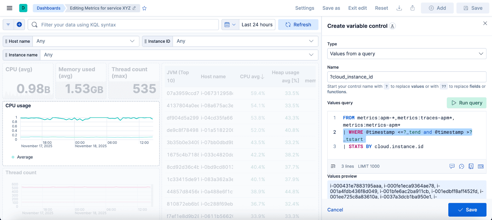 Variable controls look similar on the surface, but they come with a clever twist: instead of automatically filtering every panel on your dashboard, they can be plugged directly into ES|QL queries inside individual visualizations.