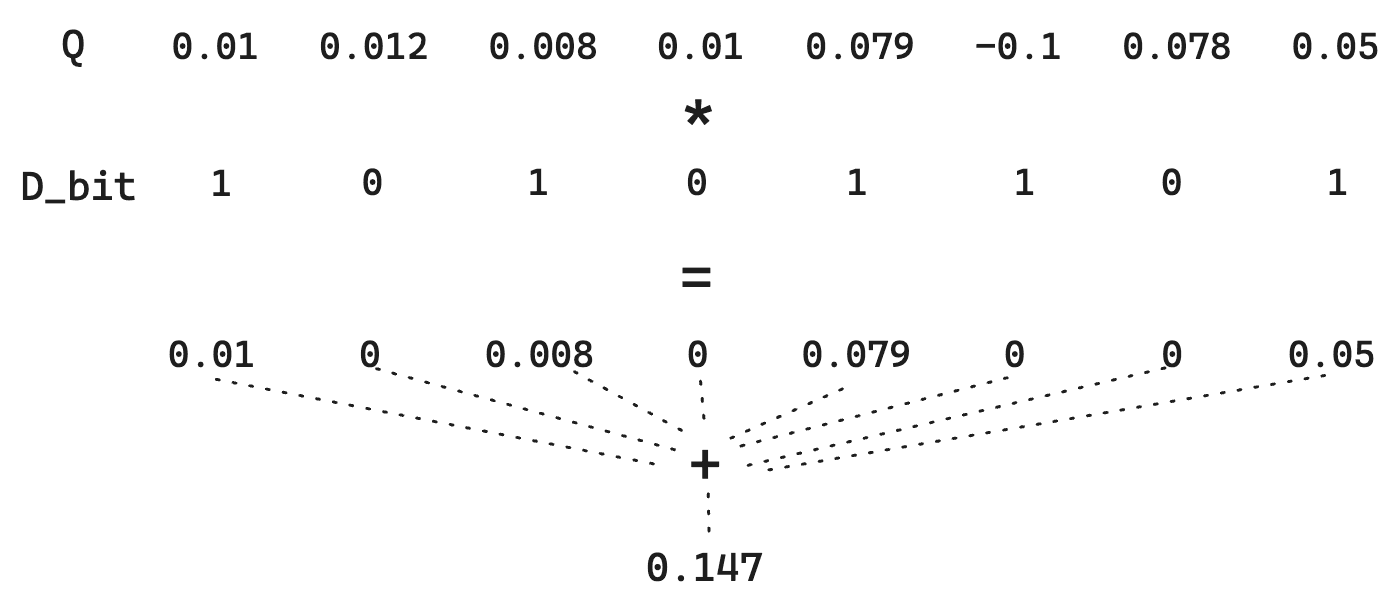 However, note how we lose the magnitude of each dimension. A 1 is a 1. So, for Q, the difference between 0.01 and 0.79 disappears. Since we are simply quantizing according to >0, we can do a small trick where the Q vector isn’t quantized. This doesn’t allow for the extremely fast bitwise math, but it does keep the storage cost low as D is still quantized.