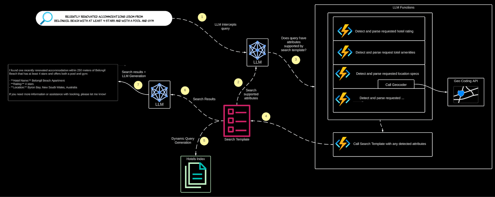 Imagine searching for “recently renovated accommodations 250m from Belongil Beach with at least 4 stars and a pool and gym” and having your search engine return exactly what you needed. Intelligent search understands intent and reasons with your queries. Reasoning and intention discovery require sophistication beyond a heuristics-only approach. This is where large language model functions and Elasticsearch search templates come together to deliver a truly intelligent search experience.