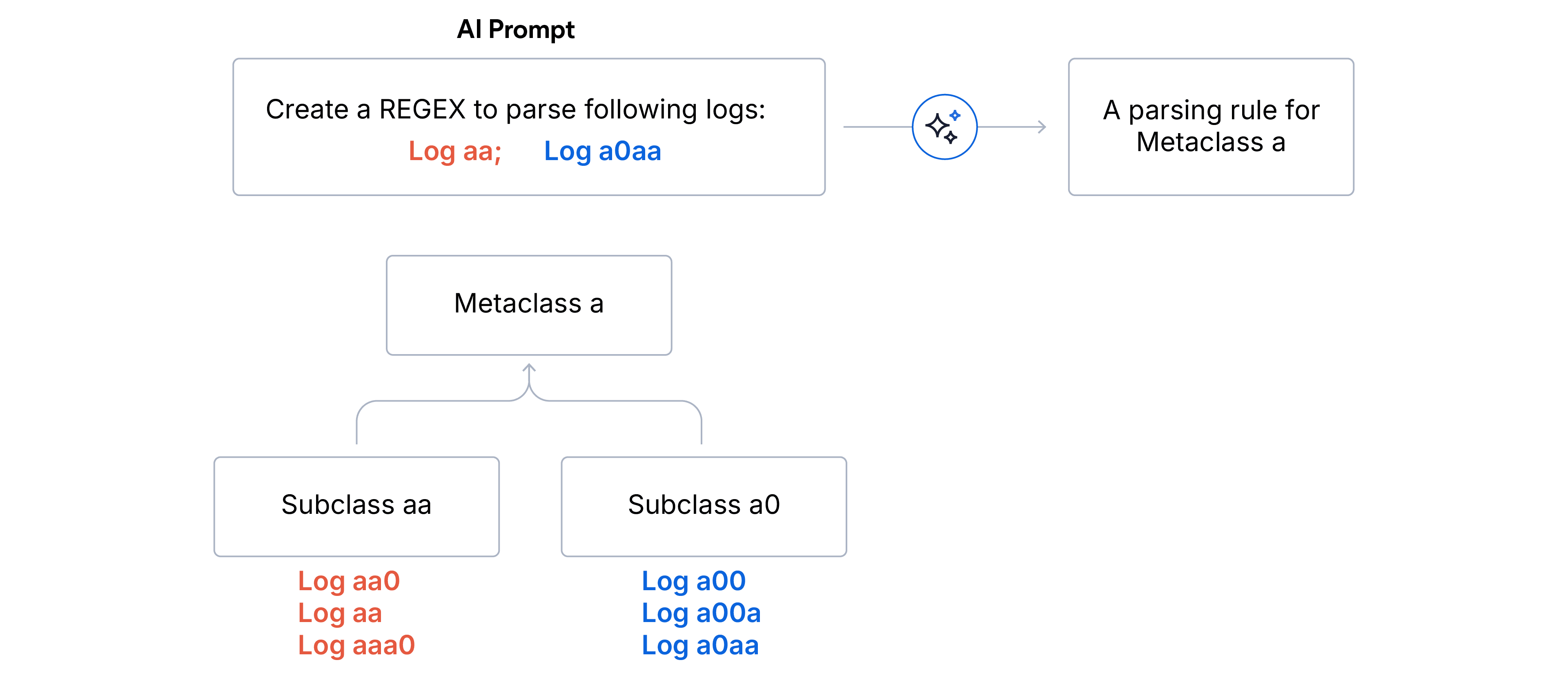 3. Rule generation Finally, we prompt the LLM to generate a regex parsing rule that fits all logs in the provided sample for each Metaclass. For our PoC, we used the GPT-4o mini model.