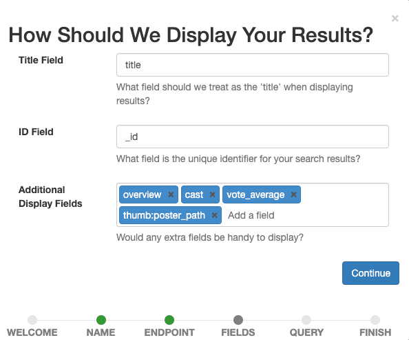 Set title as the Title Field, leave _id as the ID Field, and add overview, tagline, cast, vote_average, thumb:poster_path as Additional Display Fields. The last entry displays small thumbnail images for the movies in our results to visually guide us and the human raters.