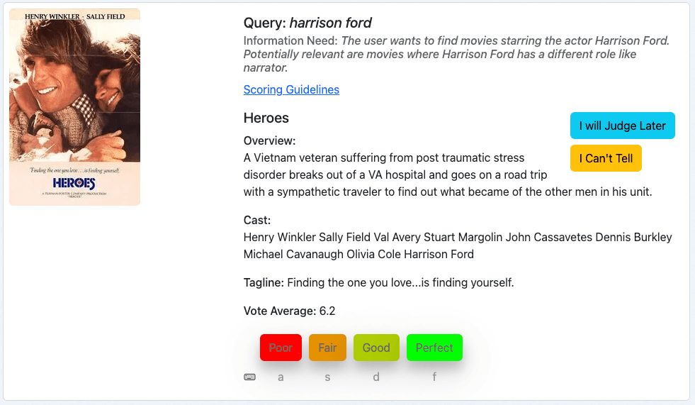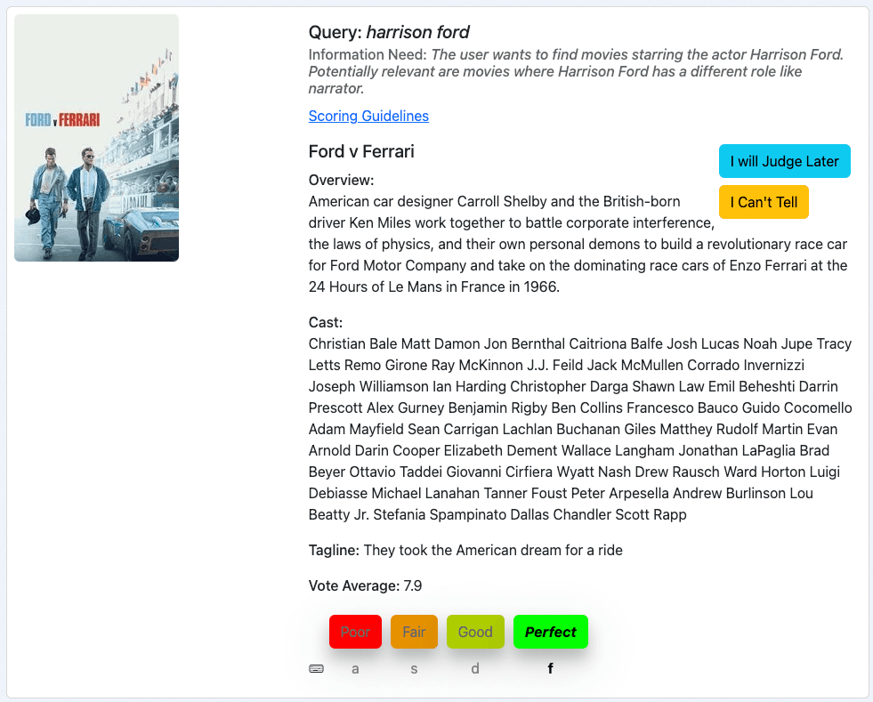 This movie is a relevant result for our query, since Harridson Ford is in its cast. We may regard more recent movies as more relevant subjectively but this is not part of our information need. So we rate this document with “Perfect” which is a 3 in our graded scale.