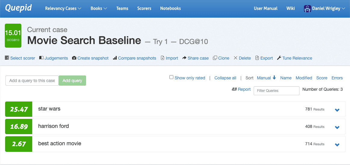 Ideally, a case contains queries that represent real user queries and illustrate different types of queries. For now, we can imagine star wars being a query representing all queries for movie titles, harrison ford a query representing all queries for cast members, and best action movie a query representing all queries that search for movies in a specific genre. This is typically called a query set.