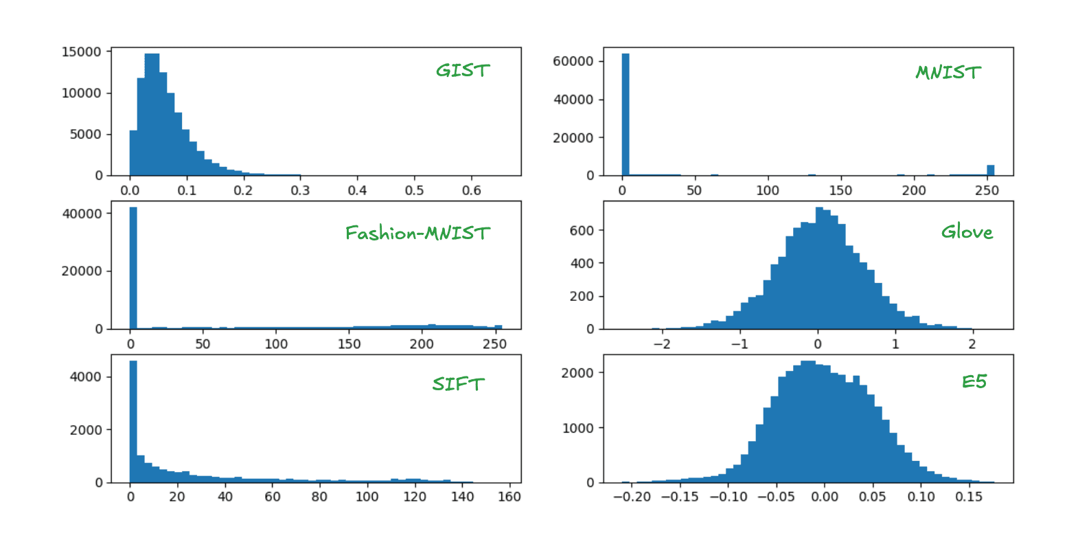 As we discussed before, many high quality learned embeddings share a similar characteristic: their components are normally distributed. However, classic approximate nearest neighbor (ANN) benchmark datasets often do not share this characteristic.
