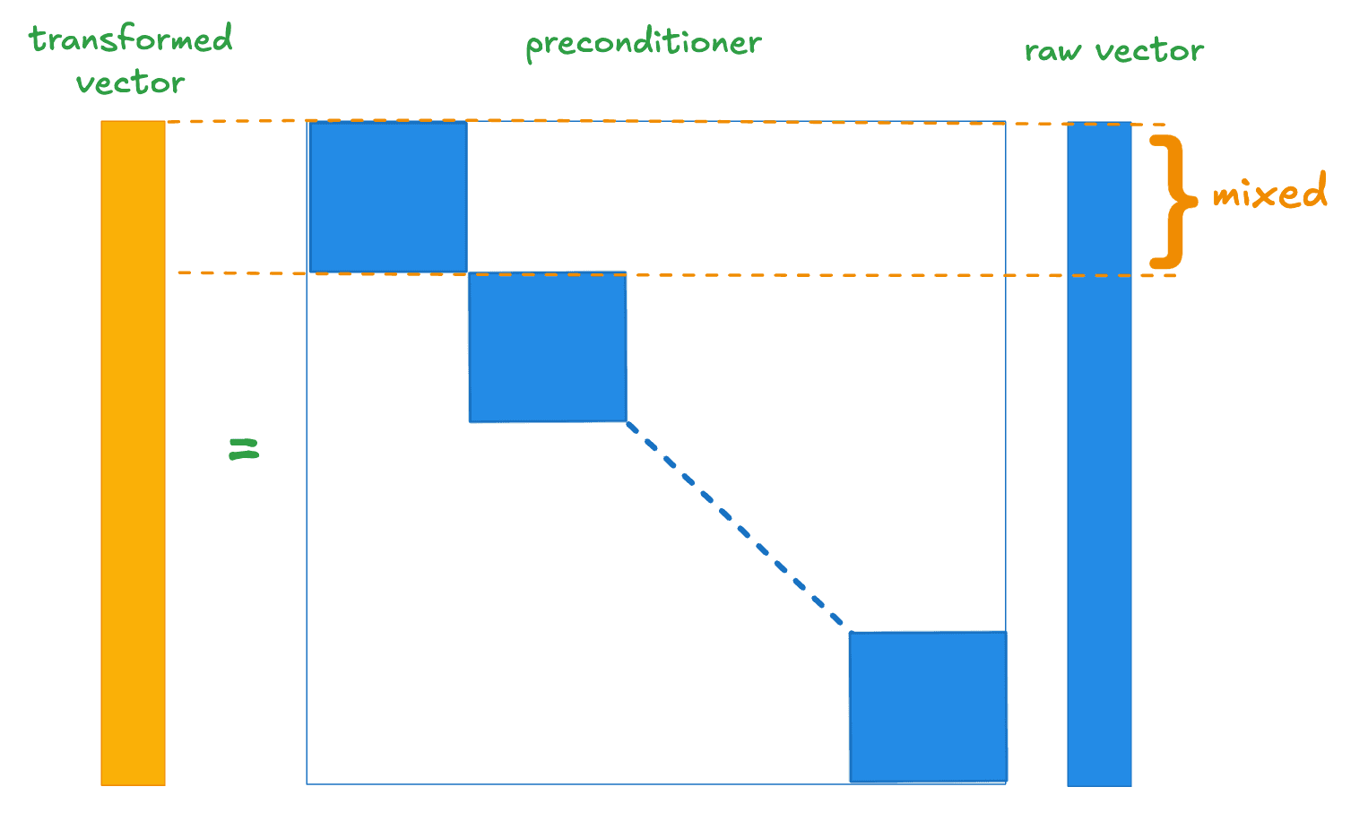 If we use a block diagonal matrix whose blocks are we drop the memory requirement for a dimensional preconditioner to and we reduce the indexing overhead by a factor of 32. This is pretty appealing.