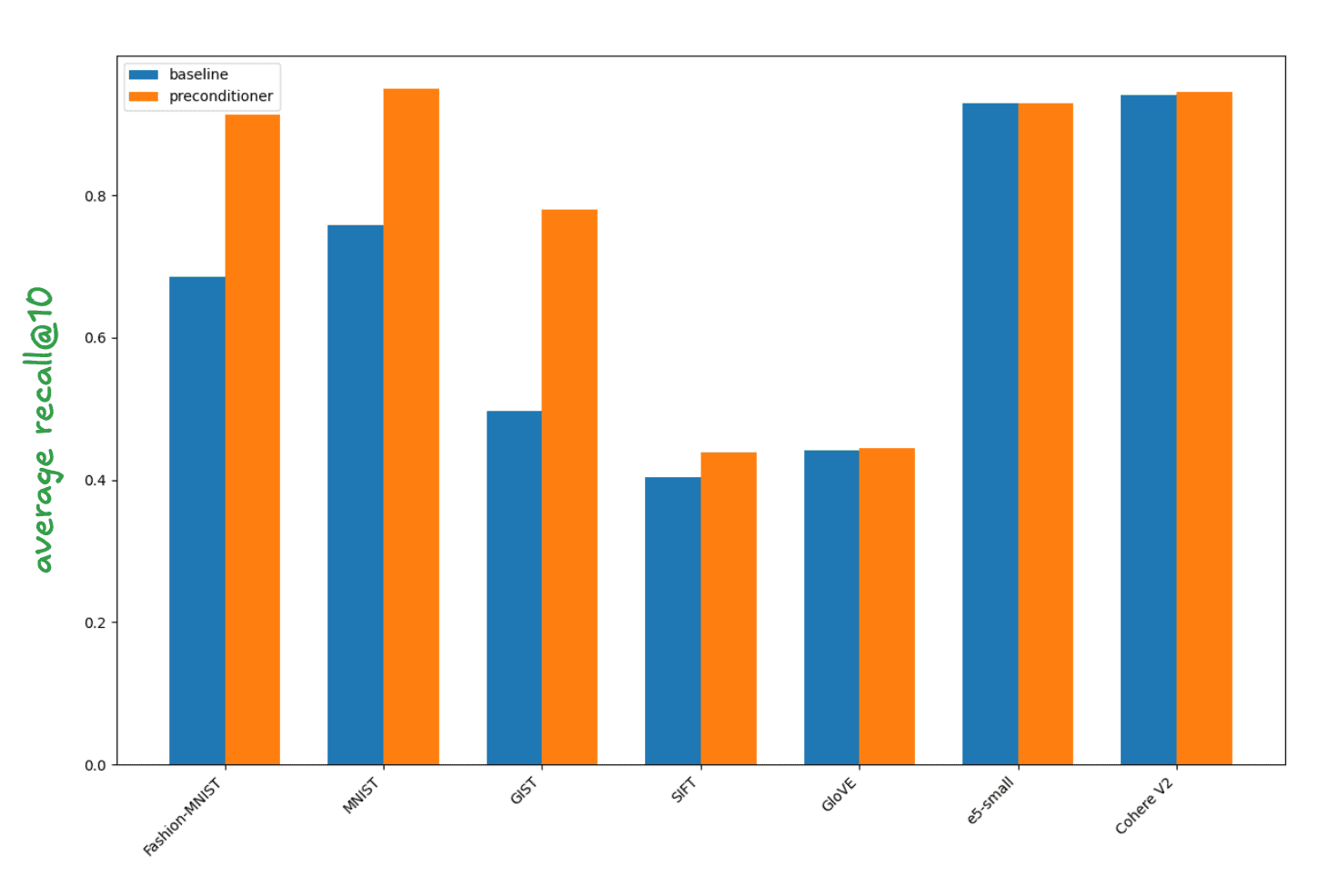 For completeness we show the average recall@10 across the five reranking depths for the baseline and block diagonal preconditioning across all the test datasets in the figure below. This shows that preconditioning is essentially a no-op on well behaved datasets.